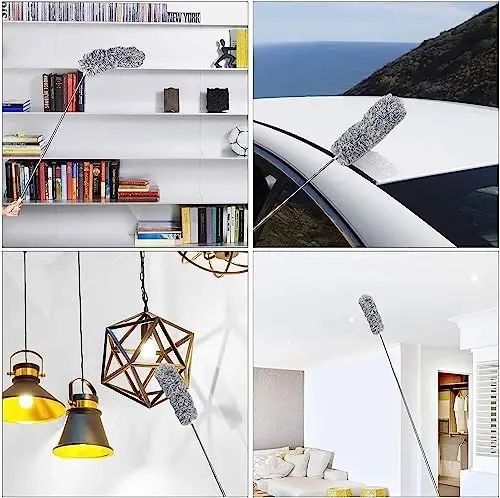 DELUX Microfiber Feather Duster is an extendable, bendable, and versatile cleaning tool designed to effortlessly clean every corner of your home and car. With its extra-long telescopic handle that extends up to 100 inches, you can easily reach high ceilings, chandeliers, ceiling fans, and other hard-to-reach areas. Its flexible and bendable head conforms perfectly to tight spaces around furniture, blinds, and car interiors. The innovative split microfiber technology effectively captures dust and hair, while the soft silicone tip protects your walls from scratches. With its durable and lightweight design, DELUX Microfiber Feather Duster provides long-lasting cleaning without fatigue. The easily removable and washable head makes cleaning and maintenance extremely practical. An ideal solution for keeping your home and car spotless, DELUX Microfiber Feather Duster simplifies your cleaning routine and saves you time. To assemble the product, you need to first connect the duster head and handle together by properly attaching the screw part to the extension pole as shown in the 2nd visual, then extend the length of the duster pole between 30 to 100 inches. Before using the bendable head, it is important to bend the head before extending the pole, otherwise it will not be easy to bend after extension due to the dispersion of stress points.