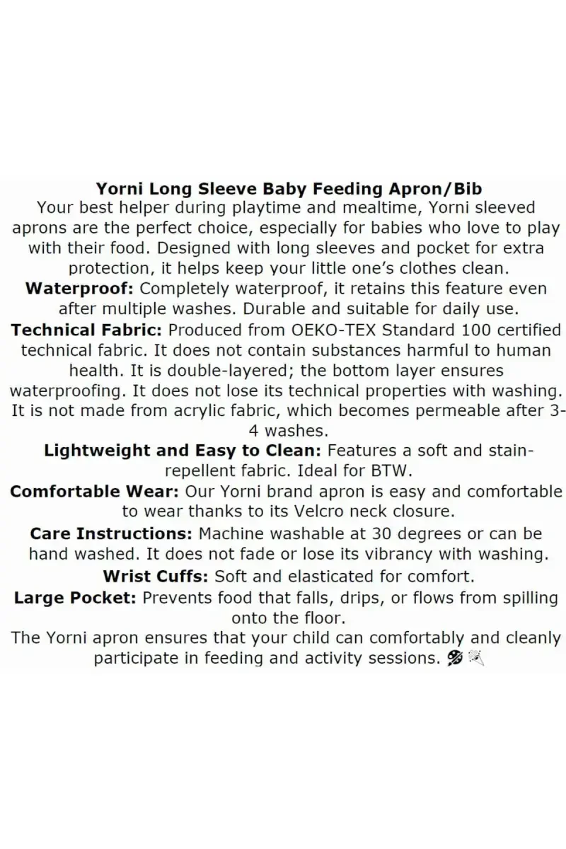 Маҳсулот YORNi томонидан юборилади ва акция нархида тақдим этилади. 100 дан ортиқ захира мавжуд. Энг кўпи билан 10 дона буюртма бериш мумкин. 10 донадан ортиқ буюртмалар Trendyol томонидан бекор қилиниши мумкин. 15 кун ичида бепул қайтариш имконияти тақдим этилмоқда. Акрил матолардан фарқли ўлароқ, узоқ муддатли сув ўтказмаслик хусусиятини тақдим этади. Европа стандартларига мувофиқ ишлаб чиқарилган. Маҳсулот овқатланиш ва ўйин вақтида болангизнинг кийимларини ҳимоя қиладиган тарзда ишлаб чиқарилган. Осон тозалаш ва парваришлаш хусусияти билан амалий фойдаланишни таъминлайди.