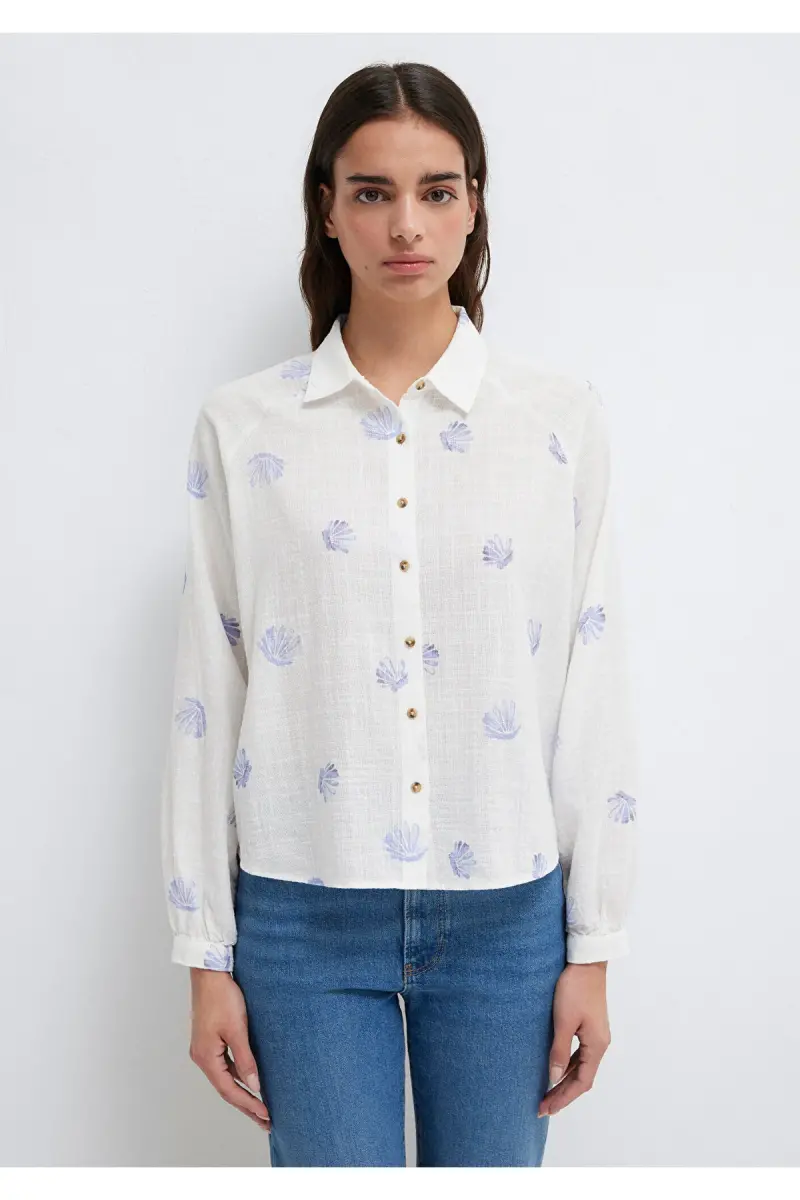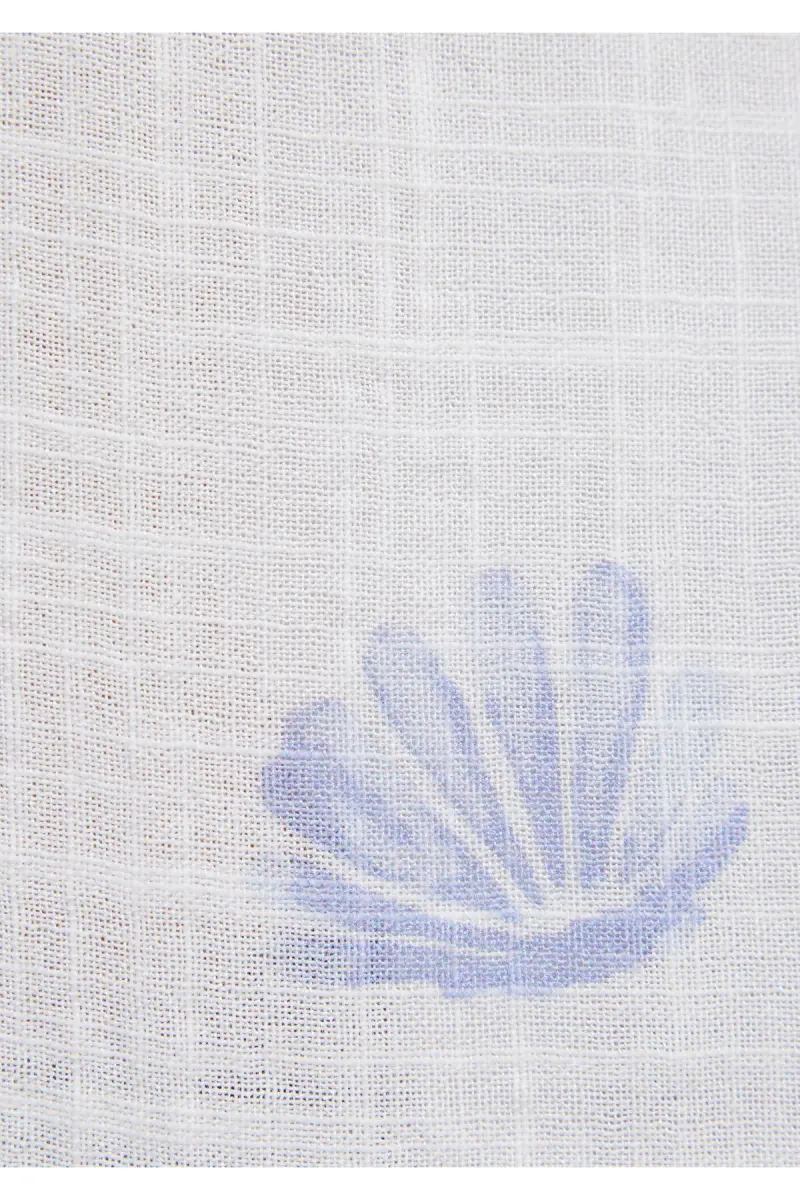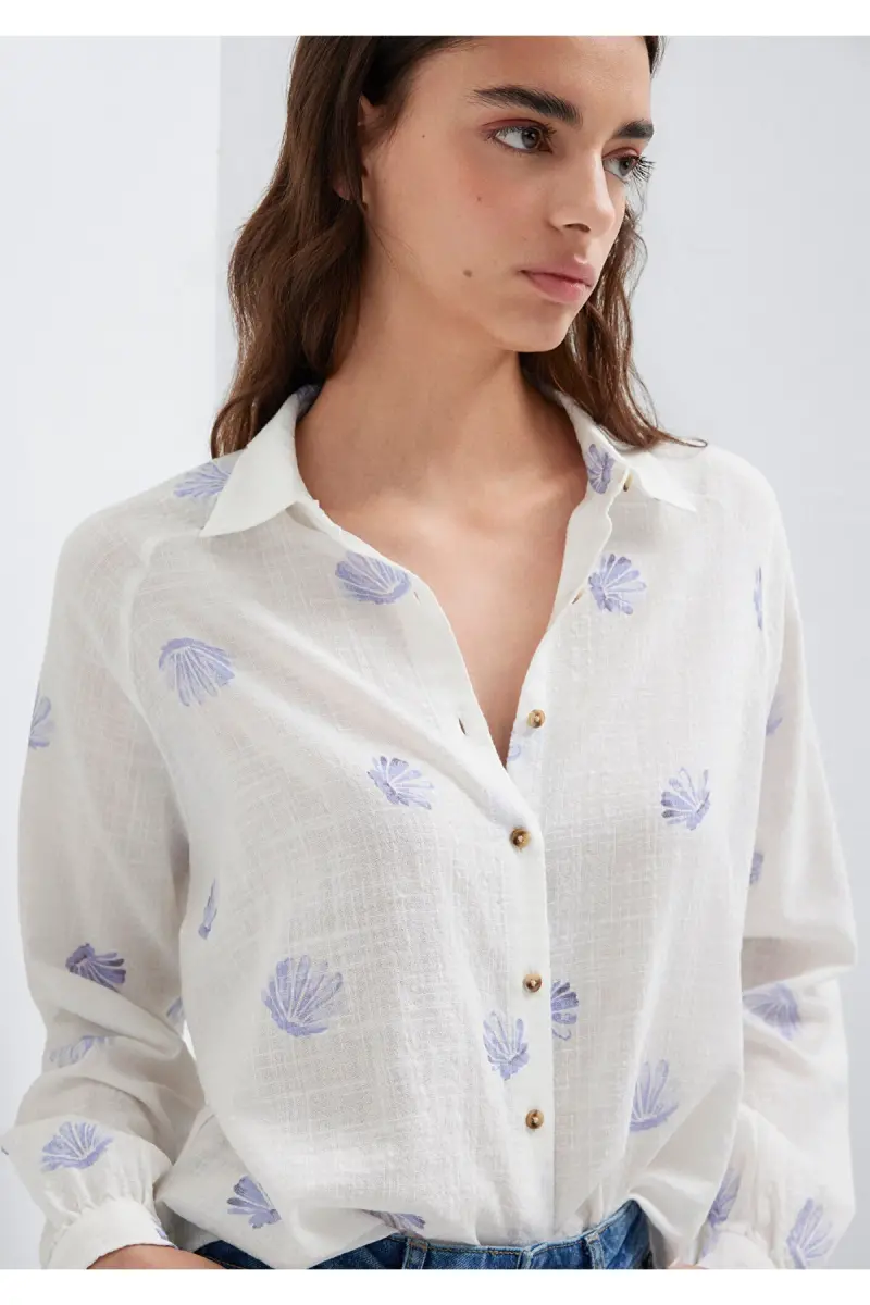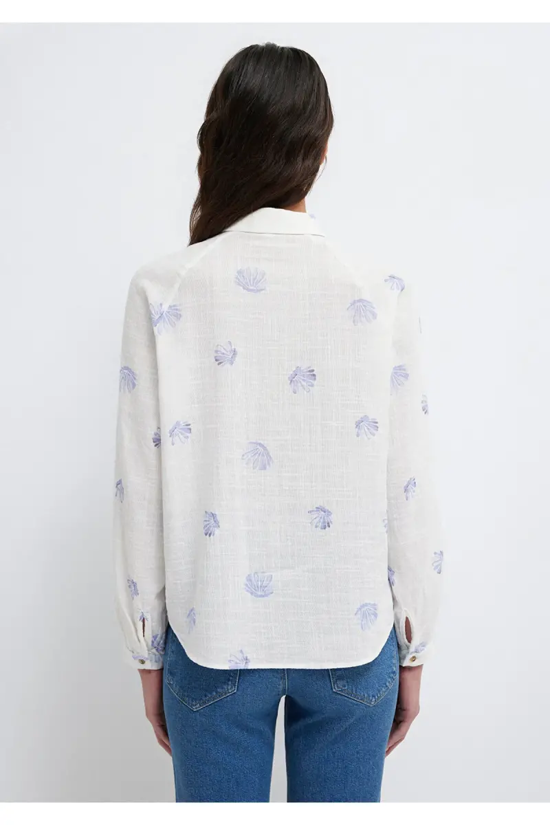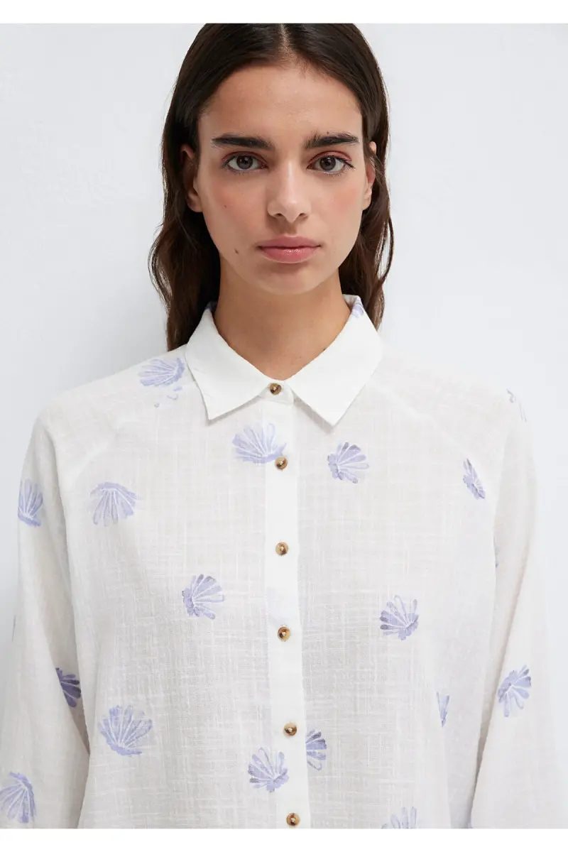 Deniz Kabuğu Baskılı Ekru Gömlek Loose Fit / Bol Rahat Kesim 122514-91497-Mavi