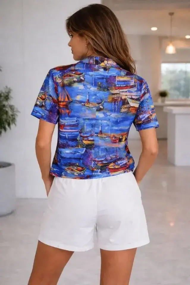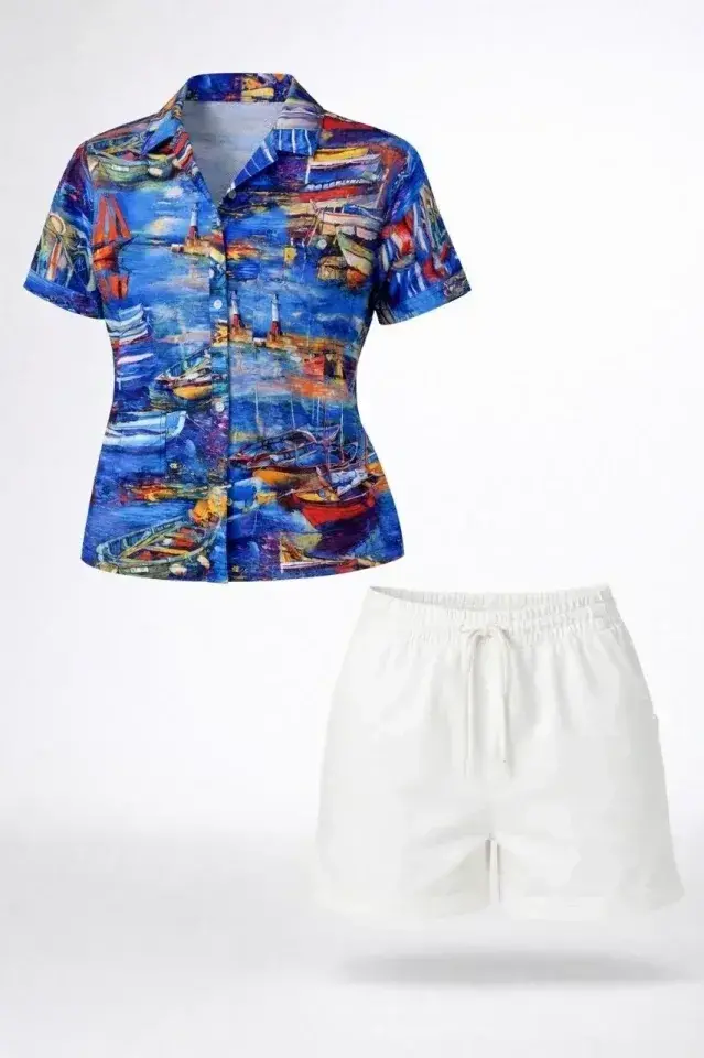 Deniz Temalı Desenli Kısa Kol Gömlek Şort Takım Yazlık Rahat Kalıp - Desenli