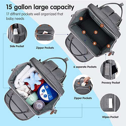 DERJUNSTAR Baby Diaper Bag Backpack with Changing Station – Large Capacity Baby Bag for Boys & Girls, USB Charging Port, Pacifier Case, Sunshade & Toy Bar, Waterproof, Pale Grey