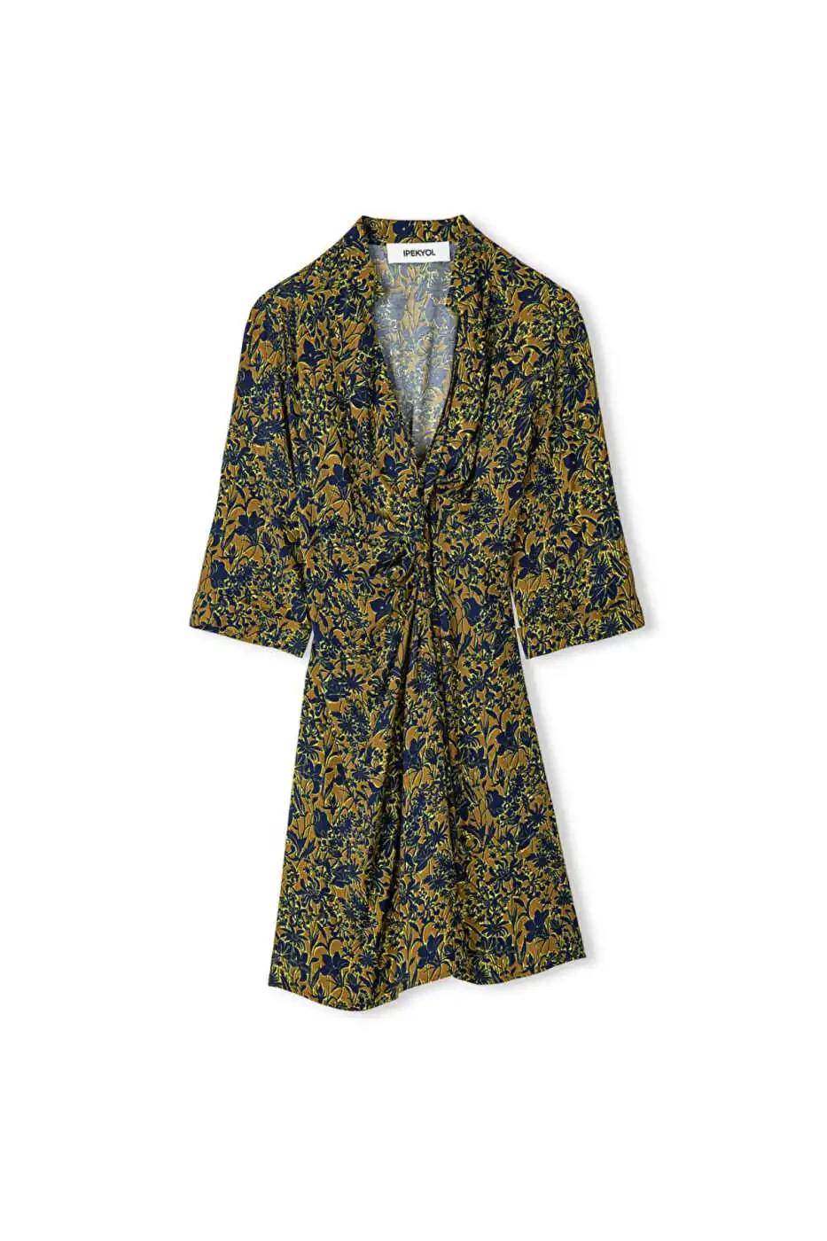 The mandarin collar detail gives the dress a classic look, while the patterned fabric provides an energetic and modern look. The thin belt at the waist of the dress emphasizes your silhouette, creating a more elegant look.