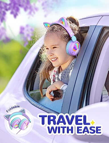 Детские наушники iClever с кошачьими ушками, светодиодная подсветка, безопасный уровень громкости 85 дБ, стереозвук, детские наушники для путешествий, школы, складные 3,5 мм проводные детские наушники для iPad, планшетов, Meow Lollipop - фиолетовый
