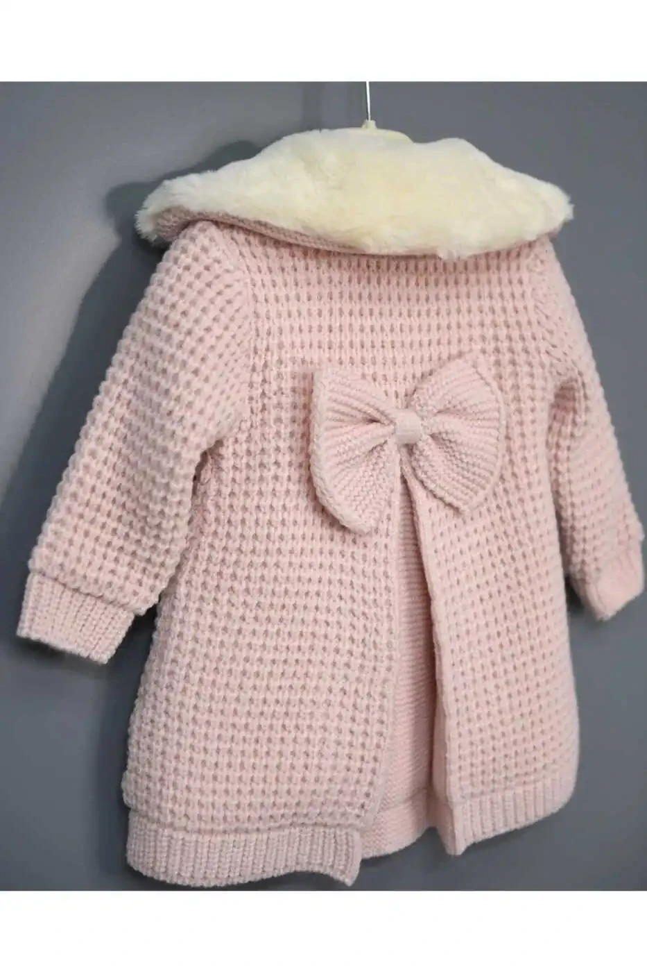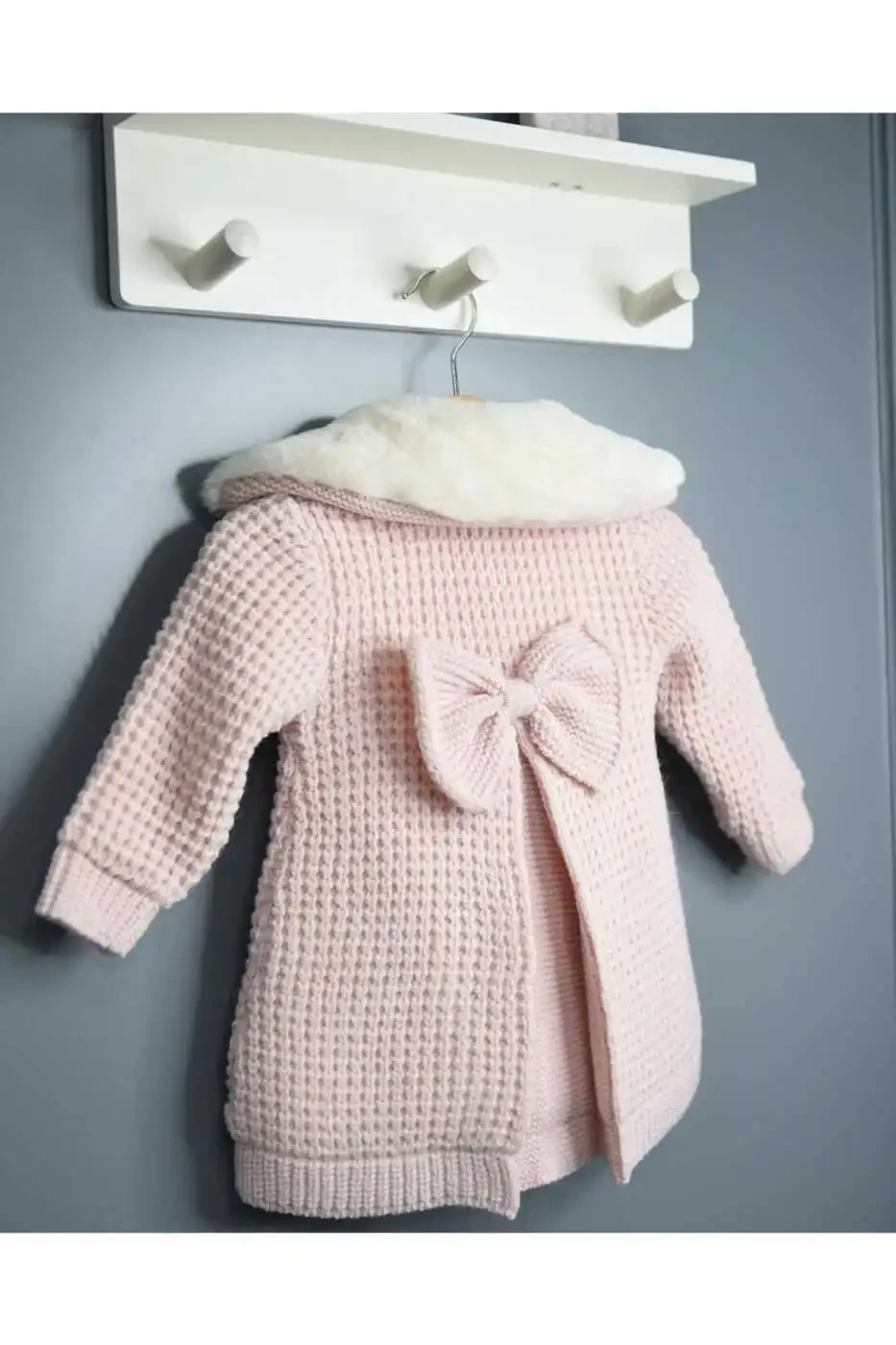 Детский кардиган из натуральной овечьей шерсти с меховым воротником и лентой - Розовый