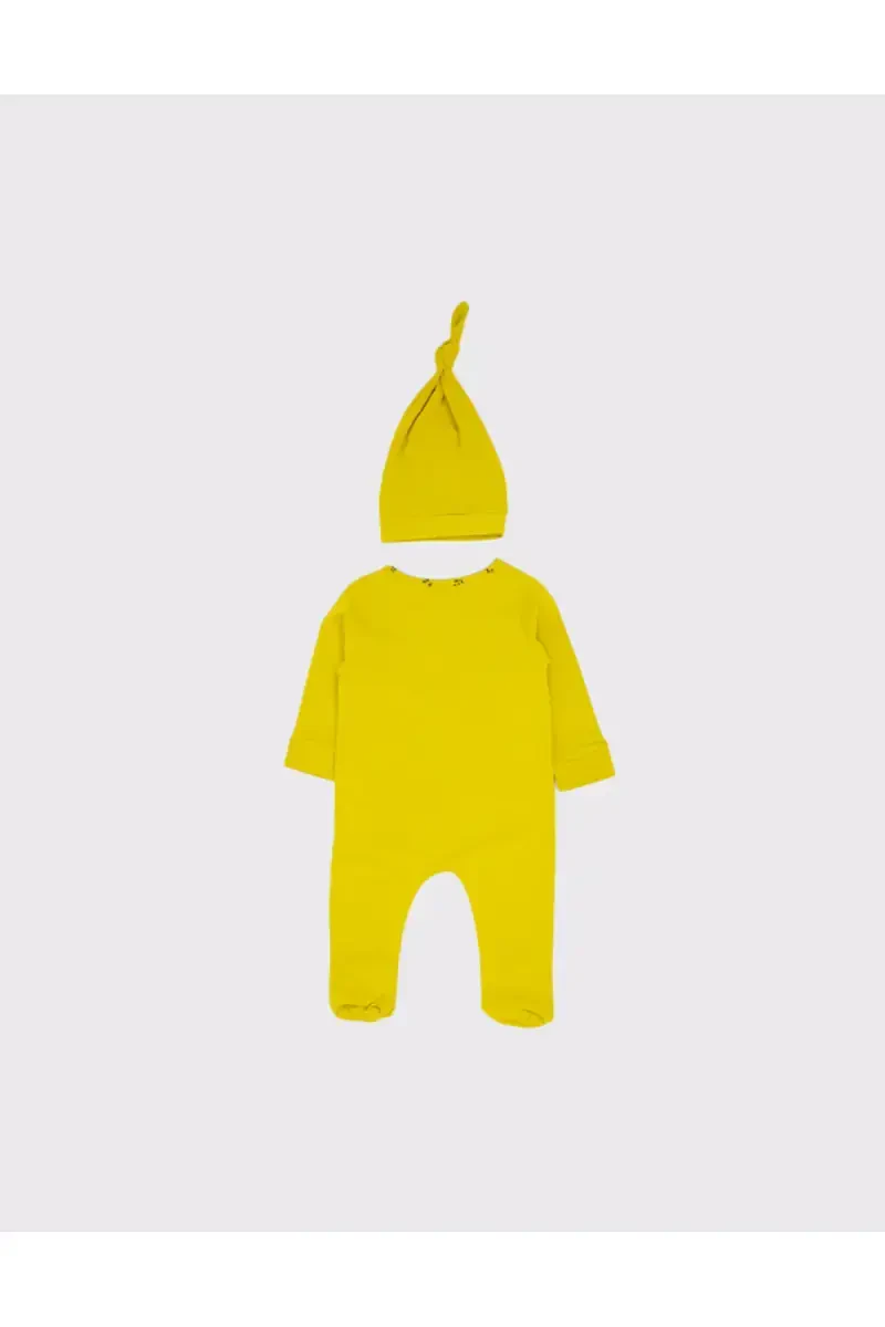 Детский комбинезон и шапочка - горчичный, изготовлены из хлопковой ткани, не повреждающей нежную кожу вашего ребенка. Комбинезон легко надевается и снимается благодаря кнопкам спереди. Шапочка согревает голову вашего ребенка и в то же время обеспечивает стильный вид. Горчичный цвет подходит как для девочек, так и для мальчиков.**Описание товара**Детский комбинезон и шапочка - горчичный - это идеальный набор, тщательно разработанный для вашего малыша, сочетающий в себе комфорт и стиль. С осознанием важности каждого материала, касающегося нежной кожи вашего ребенка, он изготовлен из 100% хлопка. Таким образом, ваш ребенок остается комфортным и спокойным в течение всего дня, а риск раздражения или аллергических реакций на его коже сводится к минимуму. Практичный дизайн комбинезона с застежками-кнопками облегчает жизнь родителям. Он обеспечивает возможность быстро и легко надевать и снимать, что также упрощает процесс смены подгузников. Этот дизайн идеально подходит для подвижных младенцев и устраняет трудности, возникающие во время одевания. Удобный крой комбинезона позволяет вашему ребенку свободно двигаться. Он может свободно двигаться, играя, спя или исследуя, что способствует его развитию. Шапочка защищает голову вашего ребенка от холода и в то же время служит стильным аксессуаром. Благодаря своей мягкой текстуре и эластичной структуре она не сжимает голову вашего ребенка и обеспечивает удобное использование. Горчичный цвет - это вневременной и модный вариант, подходящий как для девочек, так и для мальчиков. Его легко сочетать с любой одеждой, и он дополняет стиль вашего ребенка. Этот специальный набор - один из основных предметов одежды, которые понадобятся вашему ребенку в первые месяцы и в дальнейшем. Это также отличный выбор в качестве подарка на рождение ребенка. Он предлагает удобную и стильную альтернативу подарка, которая понравится новым родителям. Этот набор из комбинезона и шапочки, который вы добавите в гардероб своего ребенка, станет фаворитом как для вас, так и для вашего ребенка. Он изготовлен из качественных материалов и с тщательным мастерством и обеспечивает длительное использование. Если соблюдать инструкции по стирке, цвета и текстура сохраняются надолго. Детский комбинезон и шапочка - горчичный - идеальный выбор для комфорта и стиля вашего ребенка.**Характеристики продукта*** Изготовлен из 100% хлопковой ткани.* Подходит для кожи и гипоаллергенен.* На передней части комбинезона есть кнопки.* Обеспечивает легкое надевание и снятие.* Шапочка согревает голову вашего ребенка.* Горчичный цвет подходит как для девочек, так и для мальчиков.* Удобный крой не ограничивает свободу движений ребенка.* Можно стирать в машине.* Изготовлен из качественных материалов для длительного использования.* Идеально подходит в качестве подарка на рождение ребенка.**Дополнительная информация**Чтобы продлить срок службы изделия, следуйте инструкциям по стирке. Не используйте отбеливатель. Гладить при низкой температуре. Обязательно постирайте изделие перед использованием.