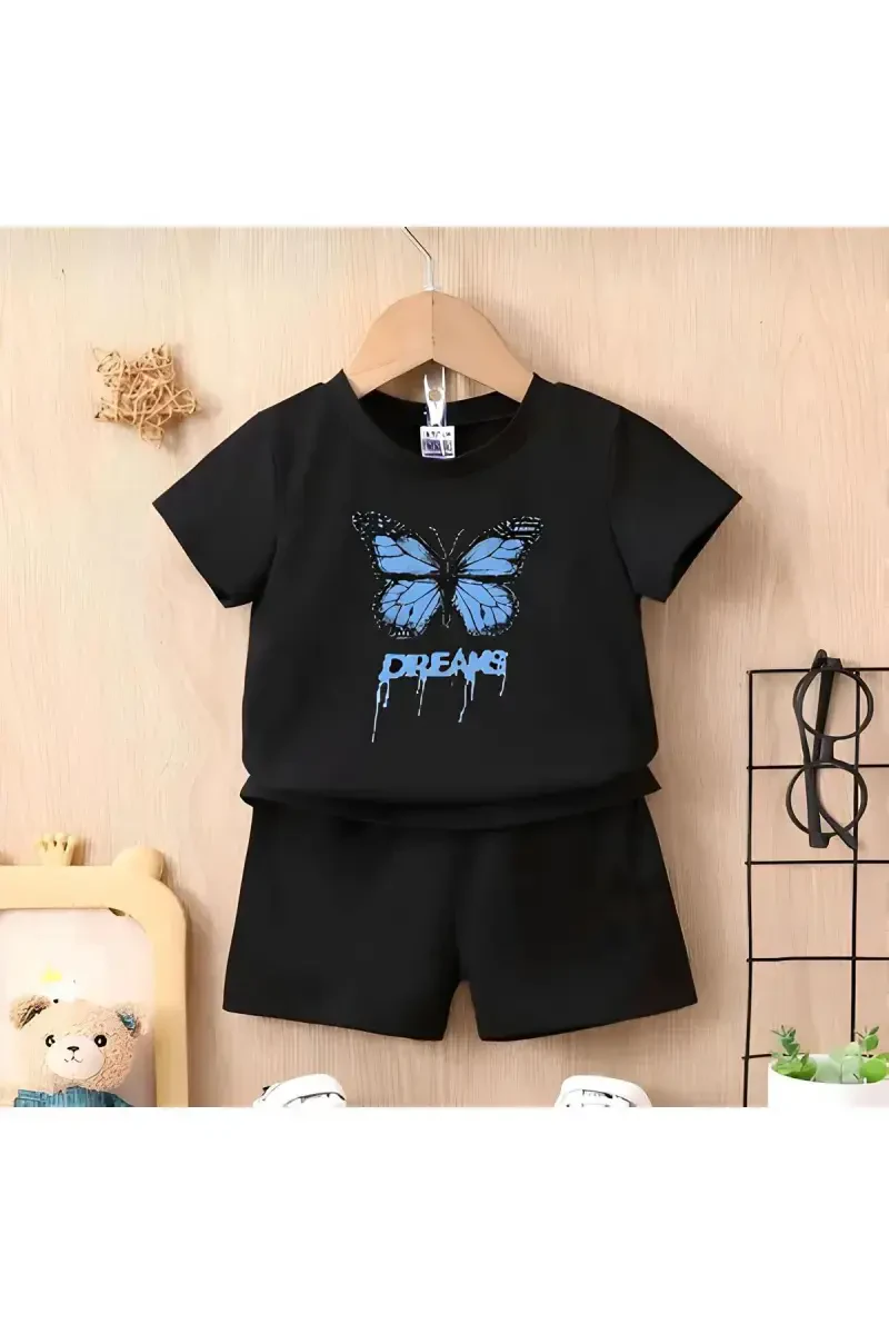Комплект для девочки: шорты и футболка, черные шорты, синяя футболка, принт Dreams, Morning Kids, детская одежда, удобный комплект, стильный дизайн, детская мода, повседневная одежда, одежда для девочек
