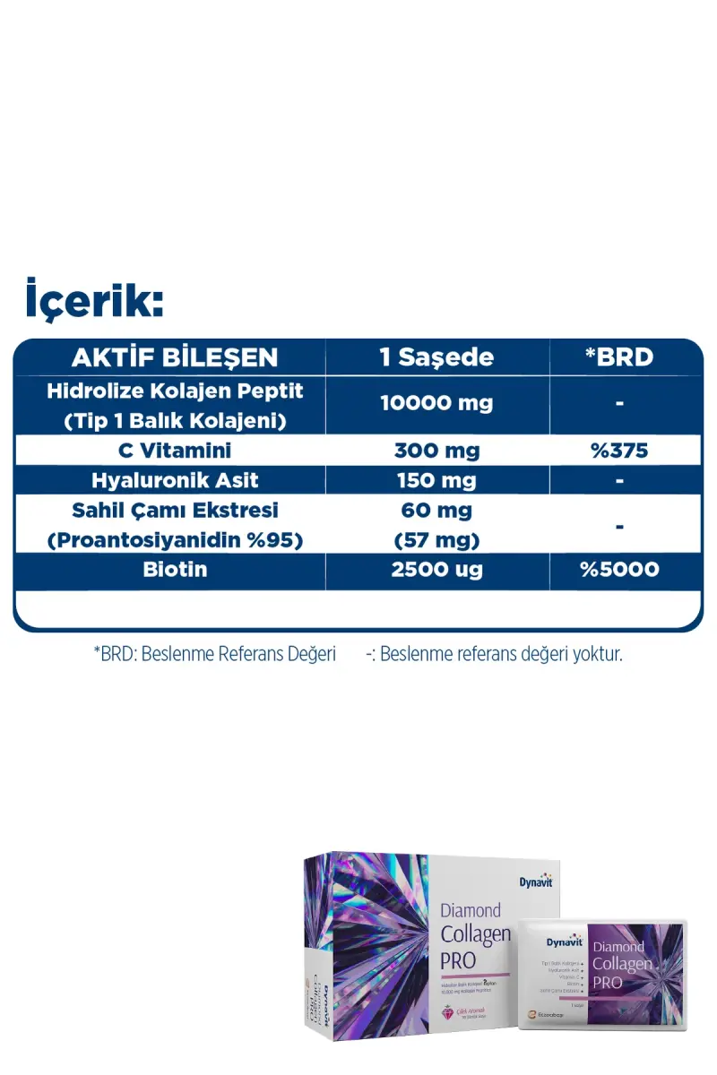 Diamond Collagen Pro 30 Saşe, teriningizning tabiiy yorqinligini tiklash va yoshligini saqlab qolish uchun maxsus ishlab chiqilgan kollagen qo'shimchasi. Tarkibida mavjud bo'lgan yuqori sifatli gidrolizlangan kollagen terining namlik darajasini oshiradi, ajinlarning ko'rinishini kamaytiradi va elastikligini va ohangini yaxshilaydi.
