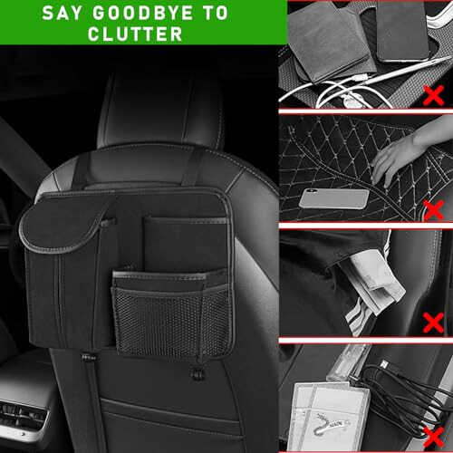 【Partitioned Storage】: The multifunctional seat storage bag adopts partitioned storage. It is designed with 2 storage slots, 2 mesh pockets, 1 tissue bag, and 2 hooks at the bottom. It can be used to store phones, water cups, lipstick, tissue, sunglasses, etc. Classifying different items can increase the storage space in the car. 【Beautiful & Practical】: A variety with fashionable colors matches with high-grade leather. Sturdy hemming design combined with even stitching increases style and taste to the car interior. Moreover, the design of tissue box cover can not only make it easier to replace tissues, but can also prevent dust. 【Leather Material】: It is made of soft leather material, with clear texture and comfortable hand feel. It is waterproof and scratch-resistant, environmentally friendly and durable. It is not easy to shed or fade with daily use. Just wipe it gently with a wet towel can make it easy to clean and maintain. 【Easy to Use】: The storage bag is designed with buckles and telescopic straps, and the length can be adjusted. Just place the storage bag against the back of the car's front seat. Then thread the straps through the headrest and snap on the buckles. And finally adjust the straps to the appropriate position. 【Wide Application】: This car seat back organizer is universal and suitable for installation behind the front seats of most vehicles. Measuring only 13.58 × 9.64 inches, it neither interferes with the use of the original car seat storage bag nor takes up too much leg room.
