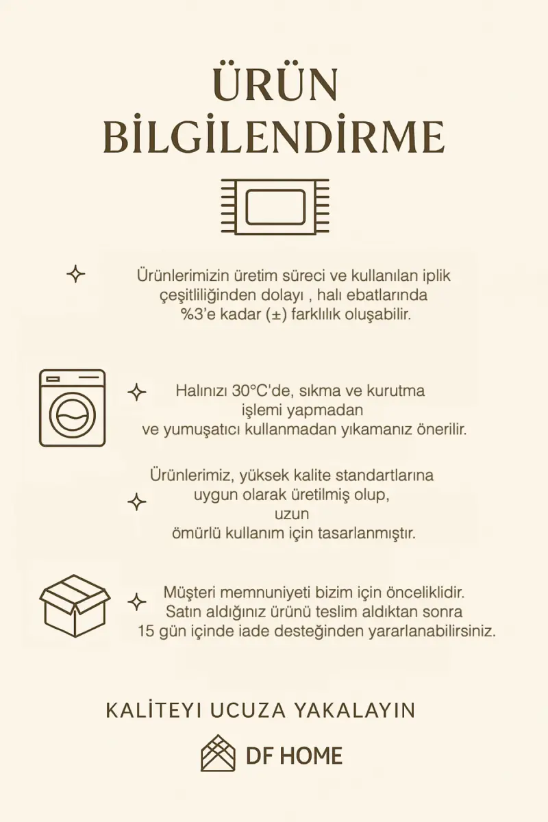 Bu ürün DF HOME tarafından gönderilecektir.Kampanya fiyatından satılmak üzere 100 adetten fazla stok sunulmuştur.İncelemiş olduğunuz ürünün satış fiyatını satıcı belirlemektedir.Bu ürünü satın aldıktan sonra iptal etmek istemeniz durumunda ilgili üründen satın alınan adedin hepsi iptal edilecektir.Bir ürün, birden fazla satıcı tarafından satılabilir. Birden fazla satıcı tarafından satışa sunulan ürünlerin satıcıları ürün için belirledikleri fiyata, satıcı puanlarına, teslimat statülerine, ürünlerdeki promosyonlara, kargonun bedava olup olmamasına ve ürünlerin hızlı teslimat ile teslim edilip edilememesine, ürünlerin stok ve kategorileri bilgilerine göre sıralanmaktadır.Bu üründen en fazla 10 adet sipariş verilebilir. 10 adedin üzerindeki siparişleri Trendyol iptal etme hakkını saklı tutar. Belirlenen bu limit kurumsal siparişlerde geçerli olmayıp, kurumsal siparişler için farklı limitler belirlenebilmektedir.15 gün içinde ücretsiz iade. Detaylı bilgi için [page="return_conditions"]tıklayın .Polyester kumaştan üretilen bu salon halısı, uzun süreli kullanıma dayanıklıdır.Orta hav yüksekliği (6-12 mm) ile konforlu bir adım hissi sağlar ve kayma riskini azaltır.Dijital baskı teknolojisi sayesinde canlı ve net tasarımlara sahip olup, mekanınıza modern bir dokunuş katar.Dot tabanı sayesinde zeminde sabit durur ve kaymaz özelliğiyle güvenli adımlar sunar.Modern tema/stiliyle evinizin dekorasyonuna çağdaş bir hava katar.Saçaksız (overlok) tasarımı, temizliği kolaylaştırır ve estetik bir görünüm sağlar.Mutfak gibi yoğun trafiğin olduğu alanlar için idealdirleke tutmayan özelliği ile pratik kullanım imkanı sunar.Dikdörtgen şekli, farklı boyutlardaki alanlara kolayca uyum sağlayarak mekânınızda esneklik kazandırır.