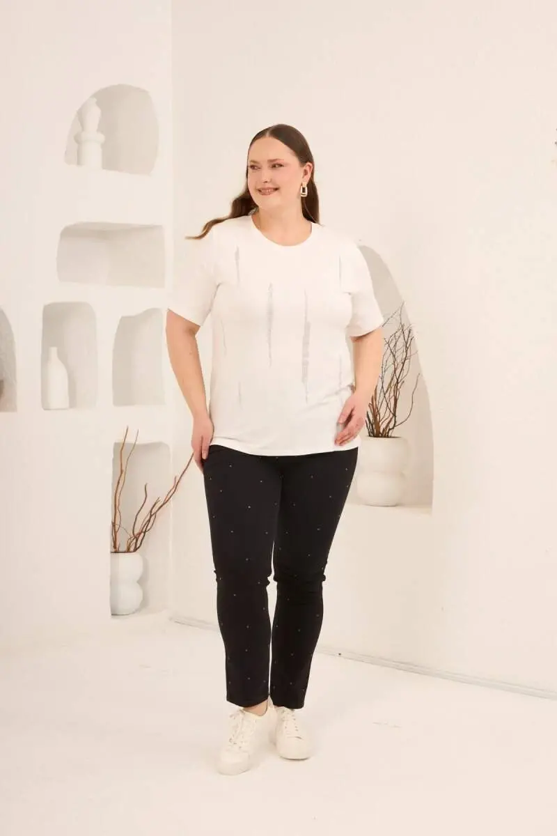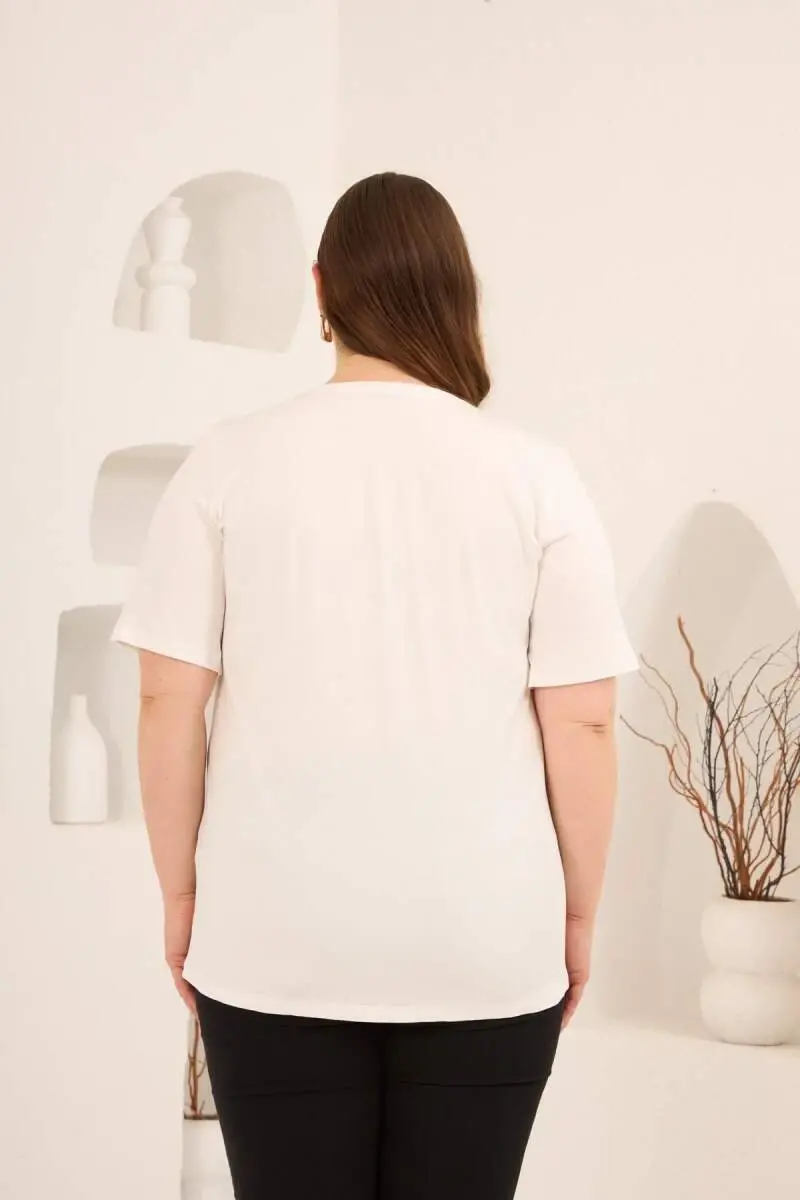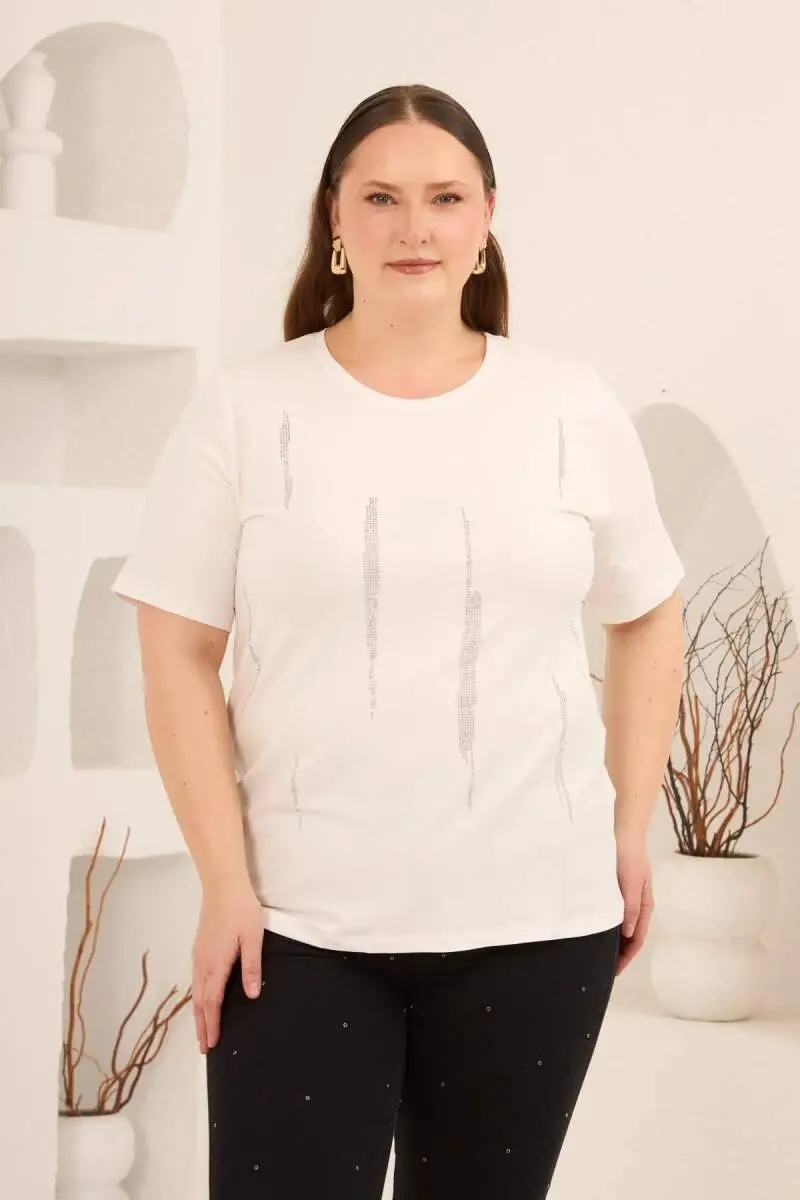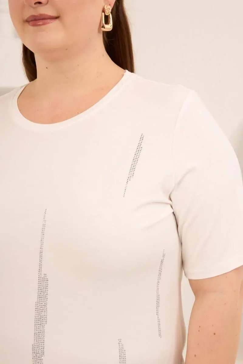 Dikey Taş Baskıl Kadın Büyük Beden Tişört Ekru