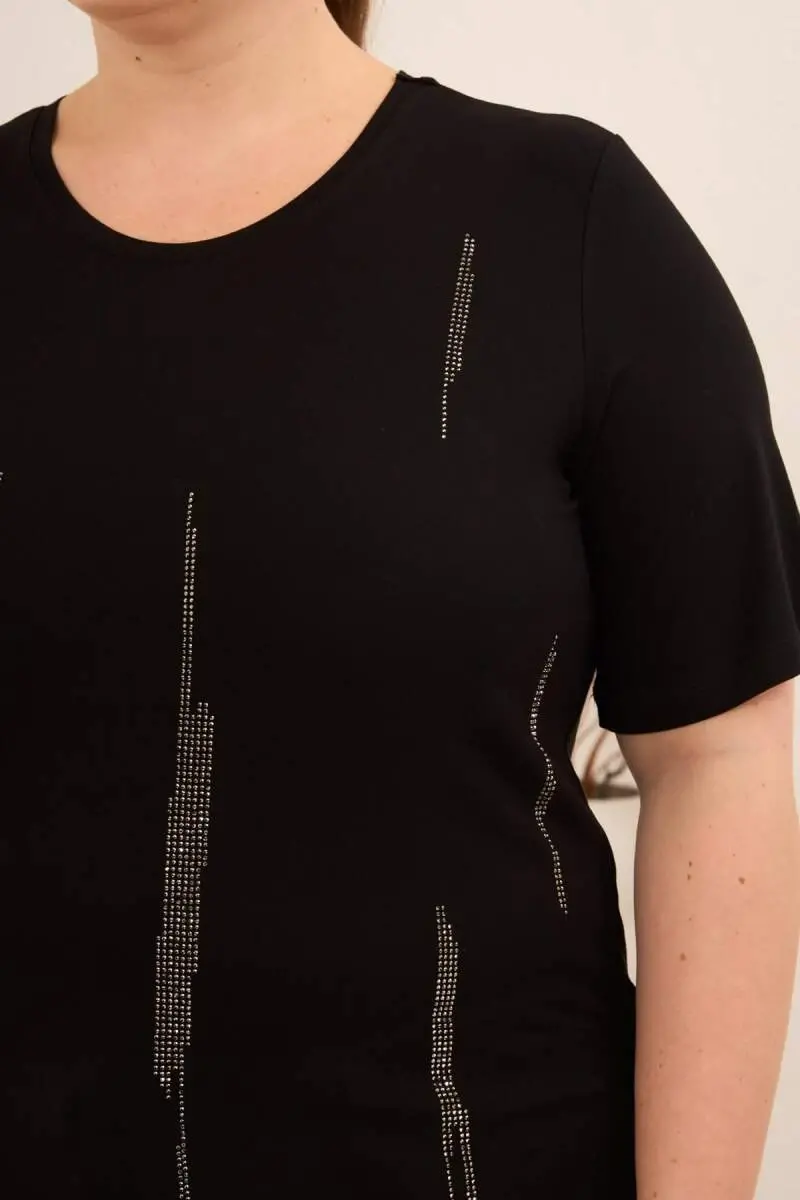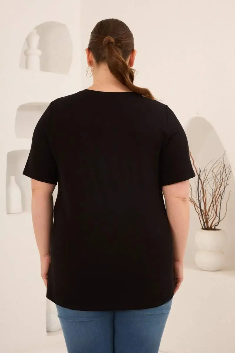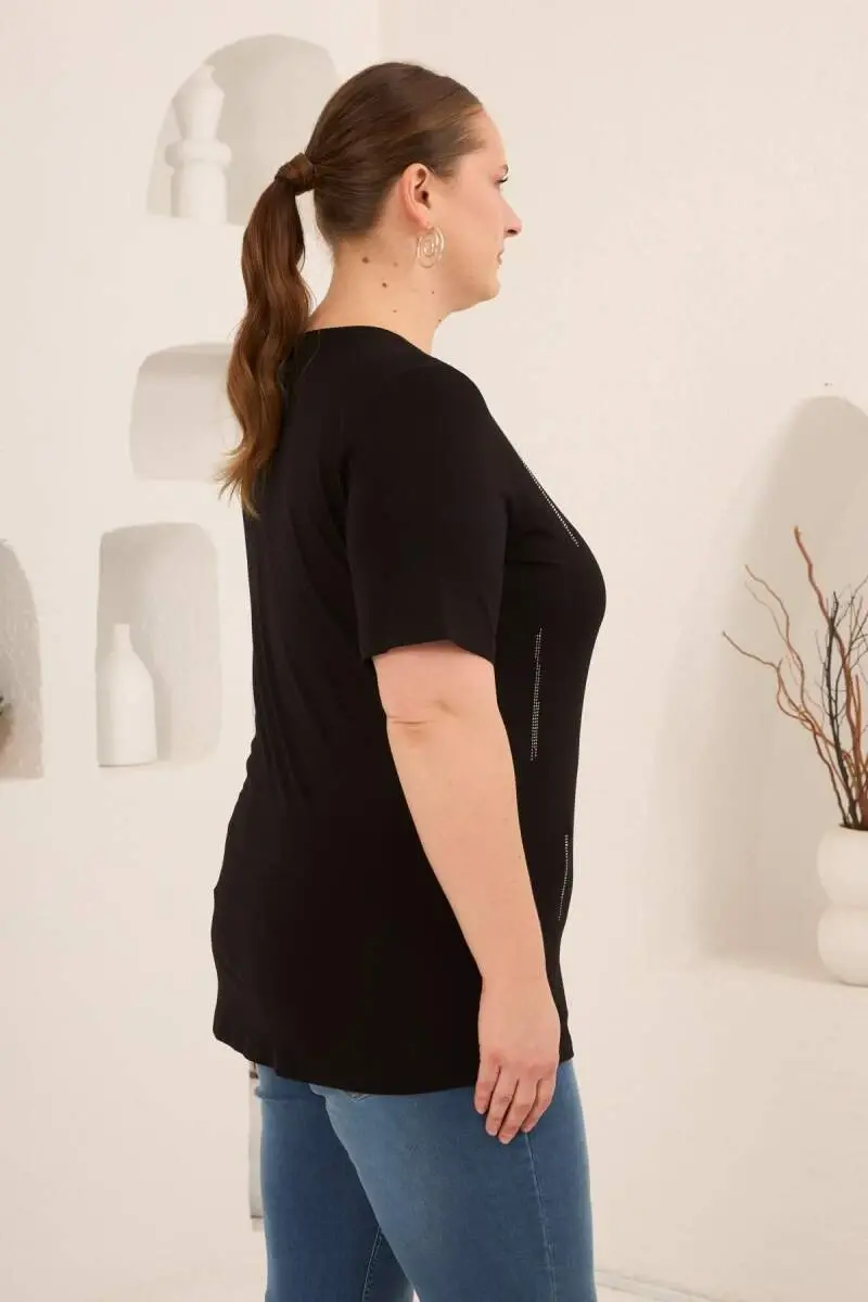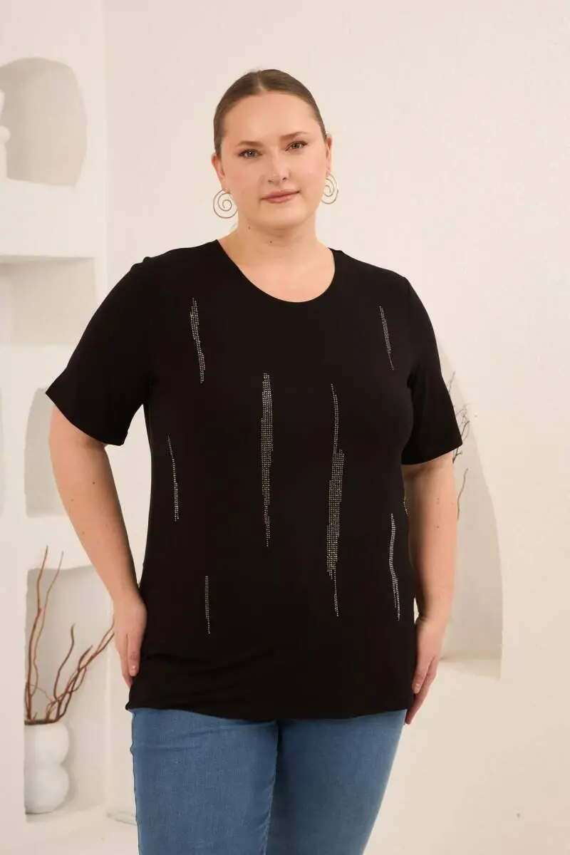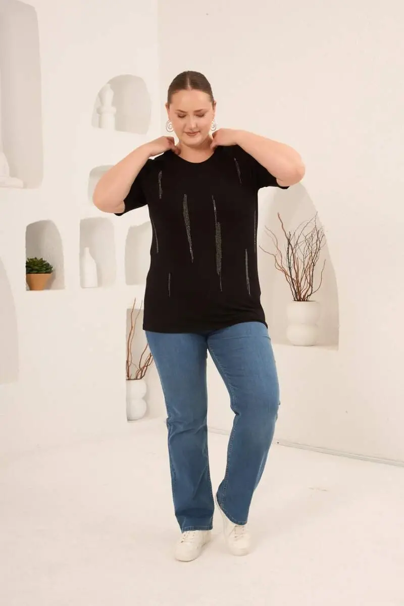 Dikey Taş Baskıl Kadın Büyük Beden Tişört Siyah
