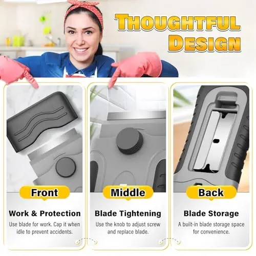 This scraper set is ideal for cleaning labels, adhesive residues, paint, and other stubborn dirt on glass, ceramic, metal, and other surfaces. Replacement blades ensure long-term use and facilitate blade replacement. Please read the user manual before use and follow safety precautions.