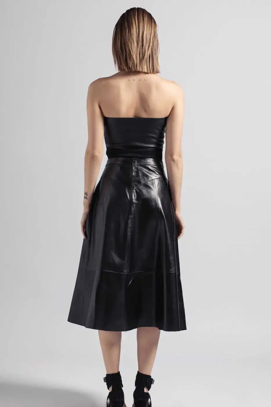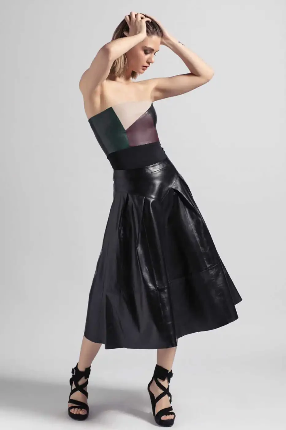 Черная женская юбка-трапеция с плиссировкой, молнией сзади, без подкладки, из натуральной кожи, - стильная и элегантная деталь, которую должна добавить в свой гардероб каждая женщина. Ее элегантный вид и комфорт подарят вам чувство особенности в течение всего дня.