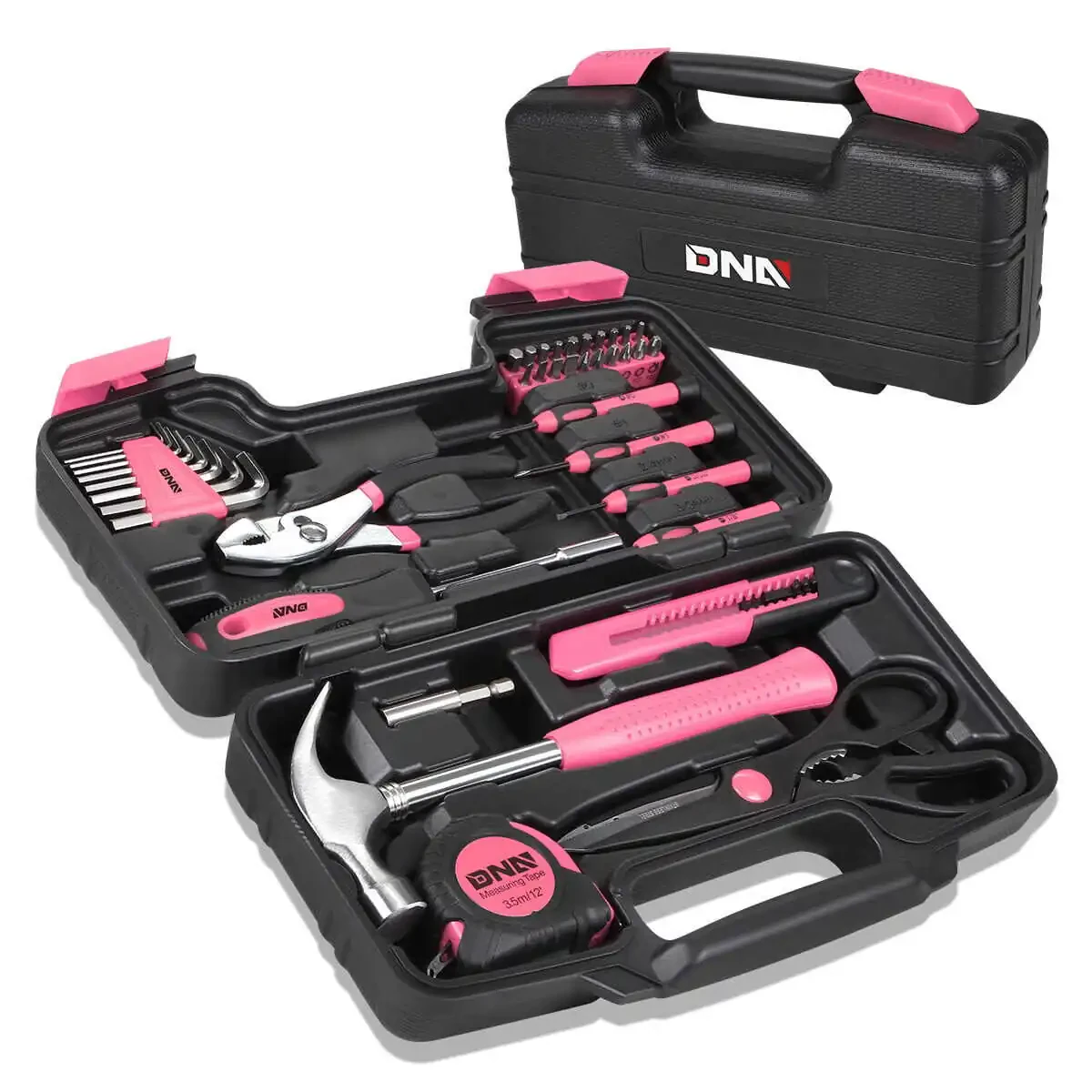 DNA Motoring Tools-00009 Pushti 39 qismli ko'chma qo'l asboblari to'plami uyda, ofisda yoki garajda kerak bo'lishi mumkin bo'lgan asosiy qo'l asboblarini o'z ichiga oladi. To'plamning pushti rangi uni boshqa asboblar to'plamidan ajratib turadi va osongina tanib olish imkonini beradi. Asboblarning tartibli saqlanishini ta'minlaydigan ABS plastik korpusi to'plamning ko'chma ekanligini oshiradi. Ushbu to'plam kichik ta'mirlash ishlari, mebel yig'ish, rasm osish va boshqa ko'plab vazifalar uchun idealdir.
