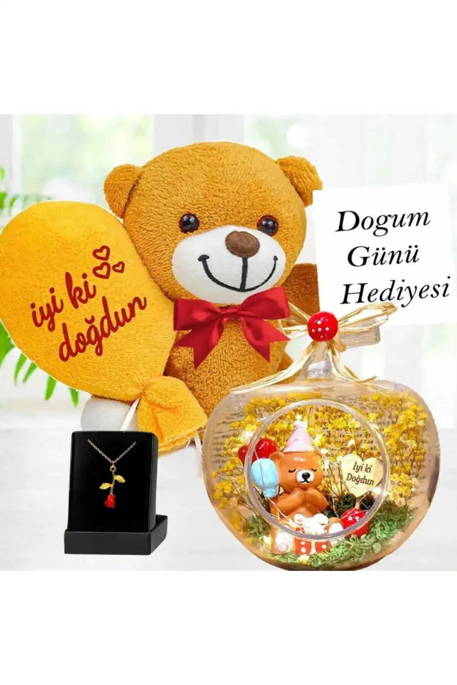 The Birthday Gift Set is a perfect option for those seeking a unique gift to make their loved ones feel special, bringing together three distinct gifts: a captivating lighted terrarium, a charming balloon bear, and a stylish gold rose necklace.