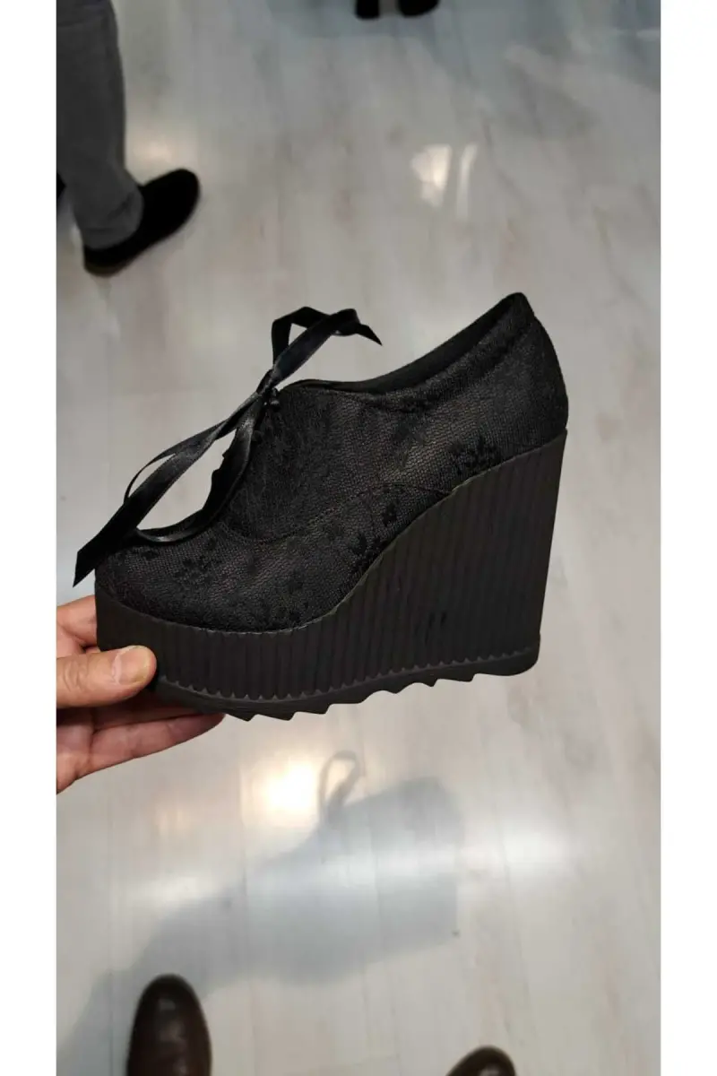 Dolgu Topuk Ayakkabı, Siyah Spor Gelin, Abiye ve Nişan Ayakkabısı 1-94377, 11-12 cm. -Siyah Dantelli Kumaş