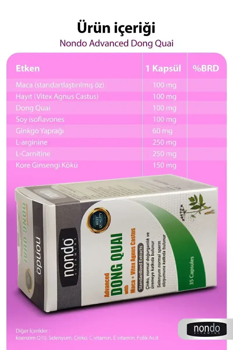 Dong Quai - ming yillar davomida an'anaviy xitoy tibbiyotida qo'llaniladigan va ayollar salomatligi uchun foydalari bilan mashhur bo'lgan qimmatli o'simlik. Dong Quai 35 Kapsula - ayollar turli hayot bosqichlarida duch kelishi mumkin bo'lgan noqulayliklarni engillashtirish va umumiy salomatlikni qo'llab-quvvatlash uchun ehtiyotkorlik bilan ishlab chiqilgan formulalardir. U tarkibida Dong Quai bilan bir qatorda, Maca, Panax Ginseng, Vitex Agnus Castus, Ginkgo Biloba, L-Arginine va Selenium kabi kuchli o'simlik ekstraktlari va ozuqalar mavjud.
