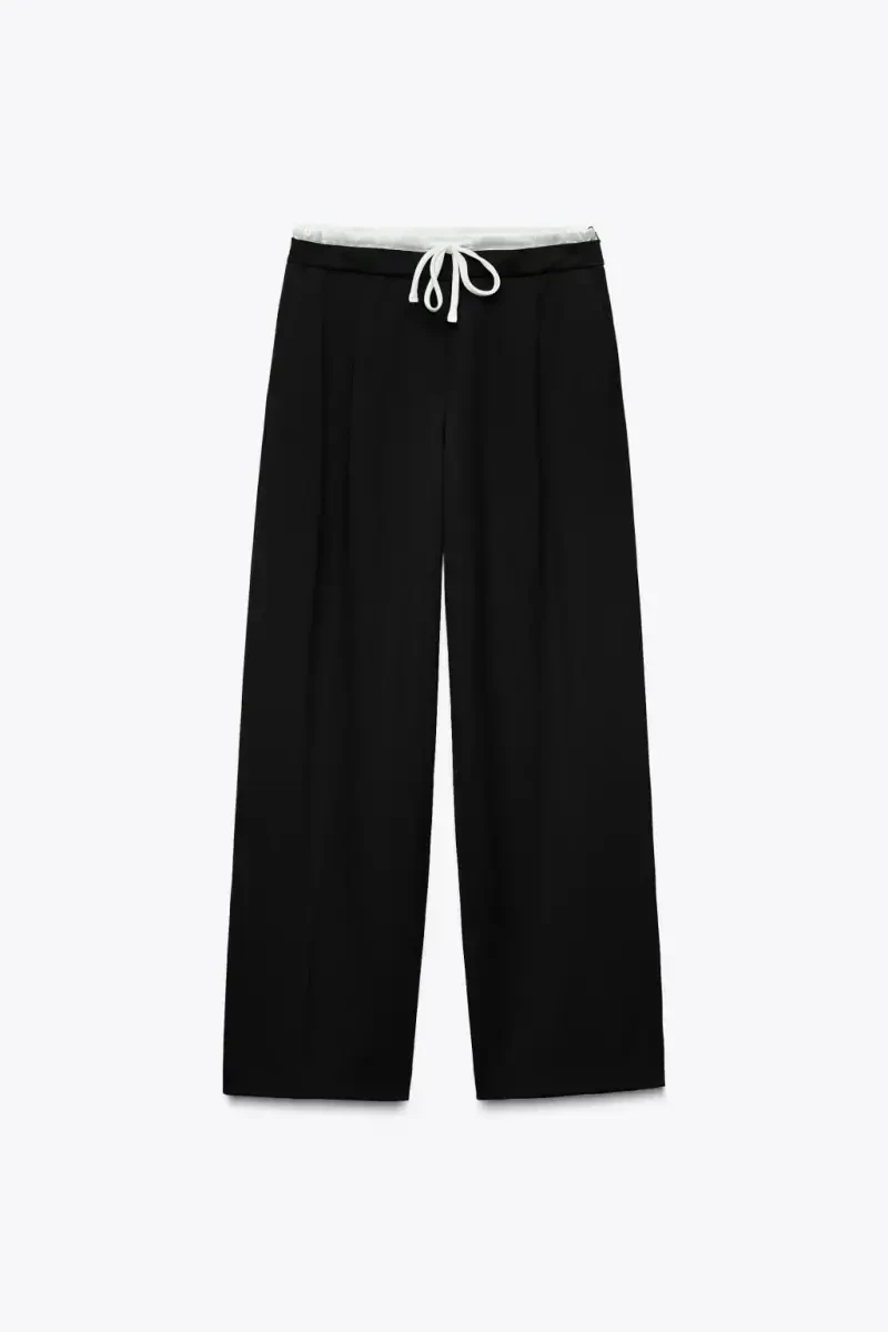 Take your style to the next level with Double Waistband Wide Leg Pants! This unique design offers a modern and comfortable look, making it a staple in your wardrobe. The most striking feature of the pants is the double waistband made of contrasting fabric with adjustable drawstrings. This detail creates a stylish look and allows you to adjust your waist as you wish. The high-waisted cut gently emphasizes your body lines, while the wide leg model creates a trendy silhouette without restricting your freedom of movement. The darts on the front ensure that the pants fit better on you, while also adding a sophisticated touch. Useful front pockets offer practicality in daily use, while welt decorative back pockets add elegance to the design. It can be easily put on and taken off thanks to the hidden side zipper. Its black color offers versatile use by harmonizing with all kinds of combinations. Whether you combine it with sneakers for daily elegance or with heels for a special evening, the Double Waistband Wide Leg Pants will always complement your style. These pants are not just a garment, but also a form of expression. It is an ideal choice to feel special and reflect your style. Thanks to its high-quality fabric, it offers long-lasting use and does not wear out easily. Get ready to be the most loved piece of your wardrobe!