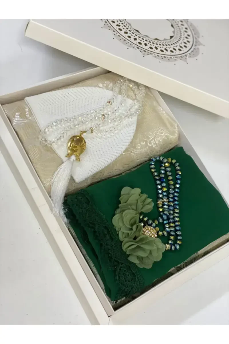 Bridal Prayer Rug Set - Green is a memento that will crown your special days, take its place in the most precious corner of your home, and be passed down from generation to generation. This elegant set offers an aesthetic feast by combining traditional motifs with modern designs. This set, which attracts attention with its fine workmanship and quality material, is not only a prayer tool, but also a work of art that will add richness to your home's decoration.Ürün AçıklamasıBridal Prayer Rug Set - Green is produced from carefully selected, first-class quality materials. In this way, it preserves its vitality and elegance for many years. The prayer rug in the set offers a comfortable ground during prayer thanks to its soft texture and makes your worship more peaceful. The traditional motifs on the prayer rug are inspired by the most beautiful examples of Turkish handicrafts and each one is carefully crafted. The soothing tone of green adds serenity to your worship, while also harmonizing with the overall aesthetics of the set. The other pieces in the set have been carefully selected to complement the design of the prayer rug. The rosary is made of high quality material, easy and comfortable to use. The details on the rosary add an elegant touch to the set. The scent sachet, on the other hand, makes your worship area even more special by spreading a pleasant scent to the environment. All these pieces are presented in a stylish box. This box allows you to safely store the set and offers a stylish presentation when gifting it to your loved ones. Bridal Prayer Rug Set - Green is an ideal option not only for newly married couples, but also for those who want to give a meaningful gift to their loved ones. You can choose this special set to make your loved ones happy and offer them a spiritual value on special occasions such as Mother's Day, birthday, and holidays. This set is not just an object, but also an expression of love and respect. This set, which will bring abundance and peace to your home, is a legacy that will be passed down from generation to generation. Crown your unforgettable memories with this special set and give your loved ones an unforgettable gift. The Bridal Prayer Rug Set - Green, with every detail carefully thought out, deserves to be in the most valuable corner of your home.Ürün Özellikleri* High Quality Material* Traditional Turkish Motifs* Soft Textured Prayer Rug* Matching Rosary and Scent Sachet* Stylish Gift Box* Soothing Green Color* Fine Craftsmanship* Long Lasting Use* Aesthetic Design* Spiritual ValueEk BilgilerSet contents: Prayer Rug, Rosary, Scent Sachet and Special Gift Box. Prayer rug dimensions: 70cm x 120cm. The rosary has 99 beads and is made of high quality material. The scent sachet contains natural essences. Cleaning recommendation: Please dry clean. The color of the product may vary slightly depending on the screen resolution. If you would like to add a gift note, you can specify it during your order.