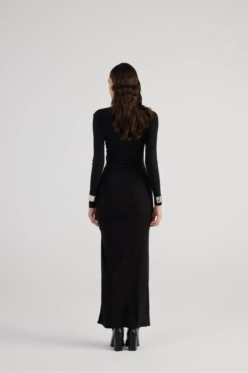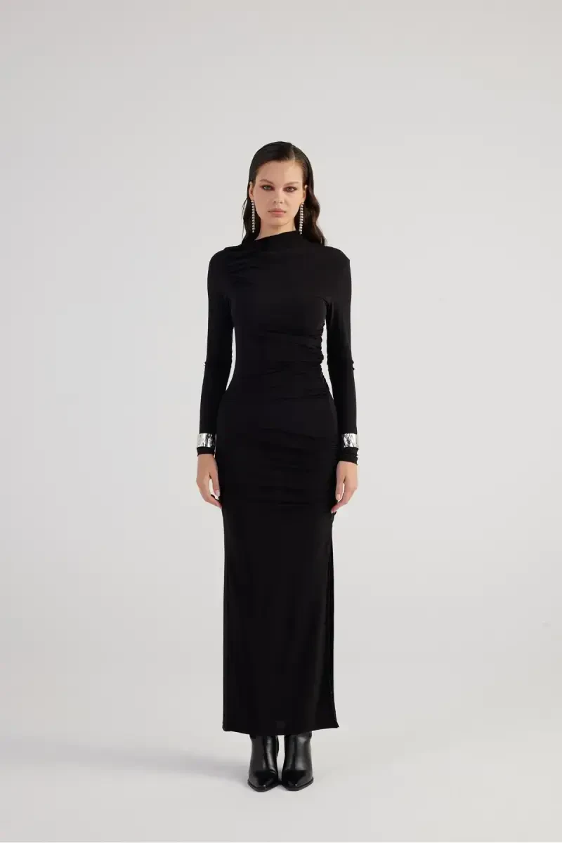 Drapeli Yirtmachli Qora Ko'ylak | Yasmiin Uzun Abiye - Chiroyli va Nafis