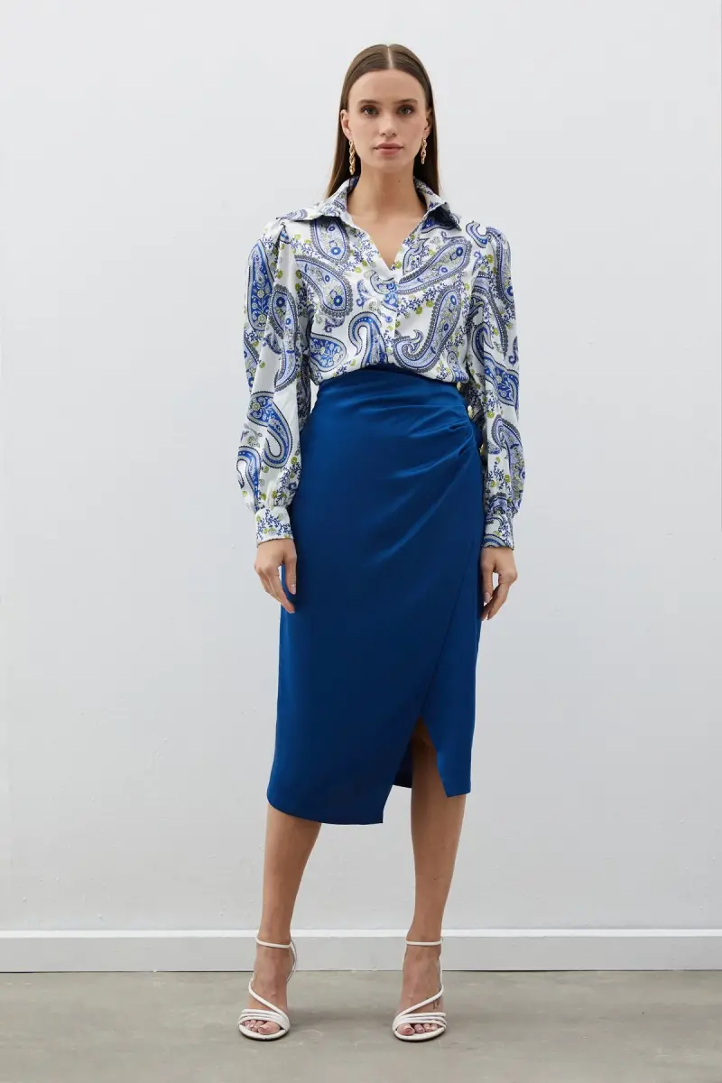 Düğme Aksesuarlı Saten Krep Etek - İNDİGO, şıklığı ve rahatlığı bir araya getiren özel bir tasarıma sahiptir. Bu etek, gardırobunuzun vazgeçilmez parçalarından biri olmaya aday! Yüksek bel kesimi, vücut hatlarınızı zarifçe ortaya çıkarırken, kruvaze kesimi ile modern ve sofistike bir görünüm sunar. Eteğin ön kısmında yer alan süs gold düğmeler, tasarıma göz alıcı bir detay katarken, saten krep kumaşın akıcı dokusu üzerinizde hoş bir his bırakır. Arka kısmında bulunan fermuar sayesinde kolayca giyilebilir ve üzerinize tam oturur. Midi boyu, hem günlük kullanım hem de özel günler için idealdir. İndigo rengi, her türlü kombine uyum sağlayarak stilinizi tamamlar. Saten krep kumaşın parlak ve yumuşak dokusu, eteğe lüks bir hava katarken, aynı zamanda konforlu bir kullanım sunar. İster şık bir bluz ve topuklu ayakkabılarla kombinleyerek özel bir davete katılın, ister günlük bir tişört ve spor ayakkabılarla kombinleyerek rahat bir şıklık yakalayın. Bu etek, her durumda stilinizi en iyi şekilde yansıtmanızı sağlar. Modelin üzerindeki ürün 36/S bedendir ve boy uzunluğu 82 cm'dir. Mankenin ölçüleri ise boy: 1,76, göğüs: 83, bel: 60, kalça: 90 şeklindedir. Siz de bu şık ve zarif eteği gardırobunuza ekleyerek her ortamda dikkatleri üzerinize çekebilirsiniz. Sateen kalitesiyle sunulan bu etek, uzun ömürlü kullanım ve şıklığı bir arada sunar. İndigo renginin asaleti ve saten krep kumaşın lüks dokusu ile bu etek, stilinize sofistike bir dokunuş katacak.