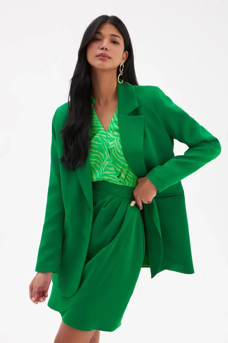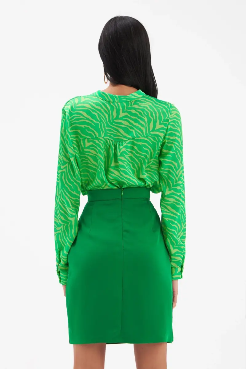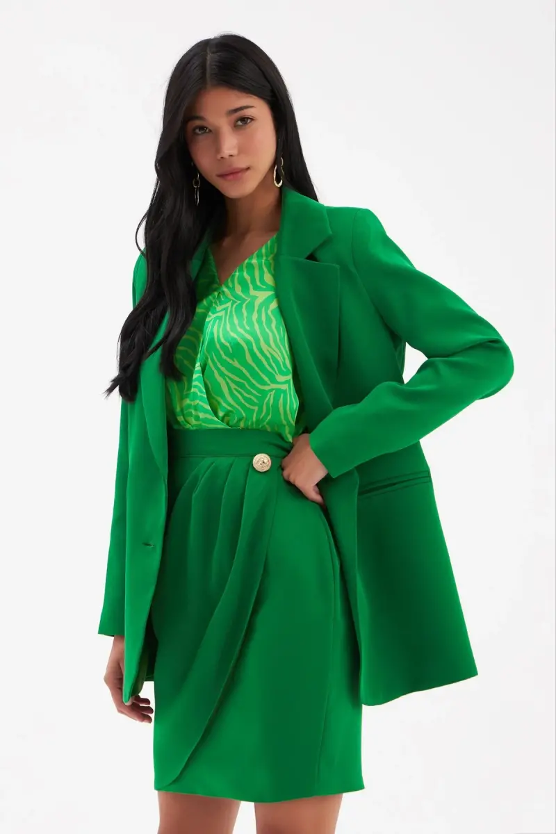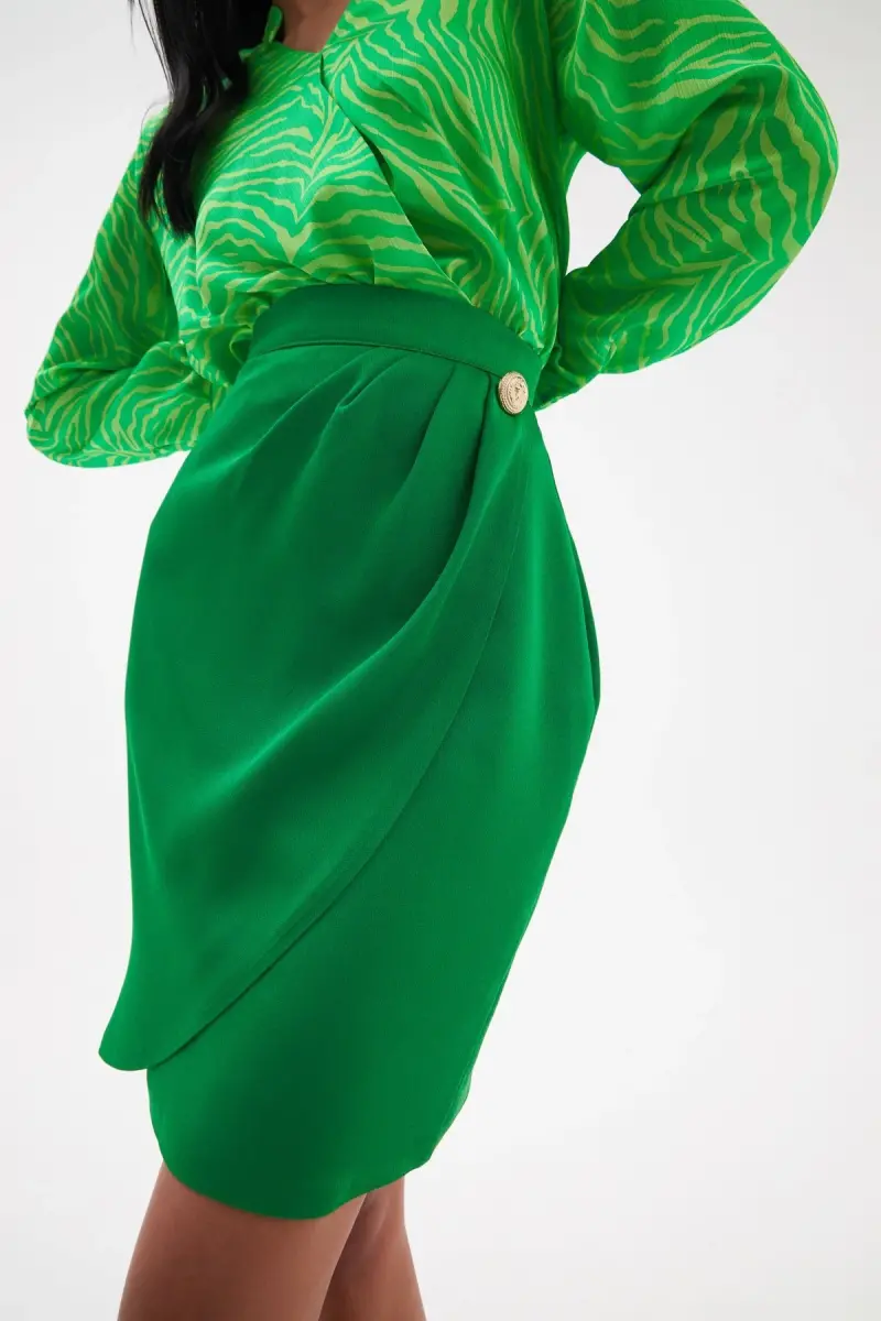 Düğme Detaylı Saten Krep Etek - Yeşil-YEŞİL