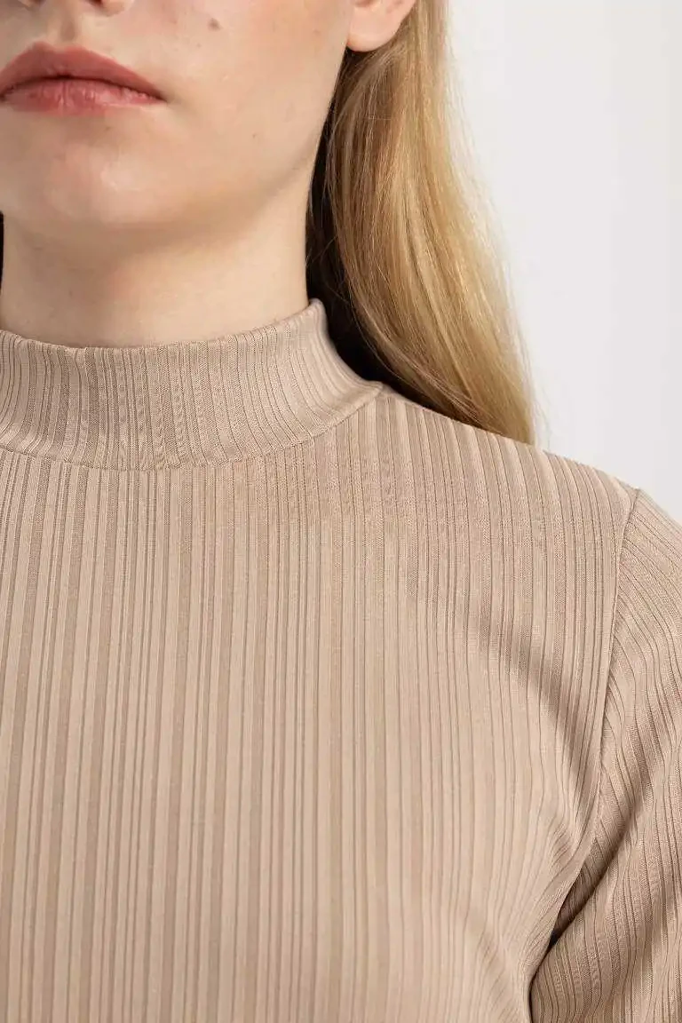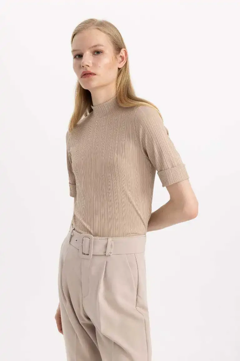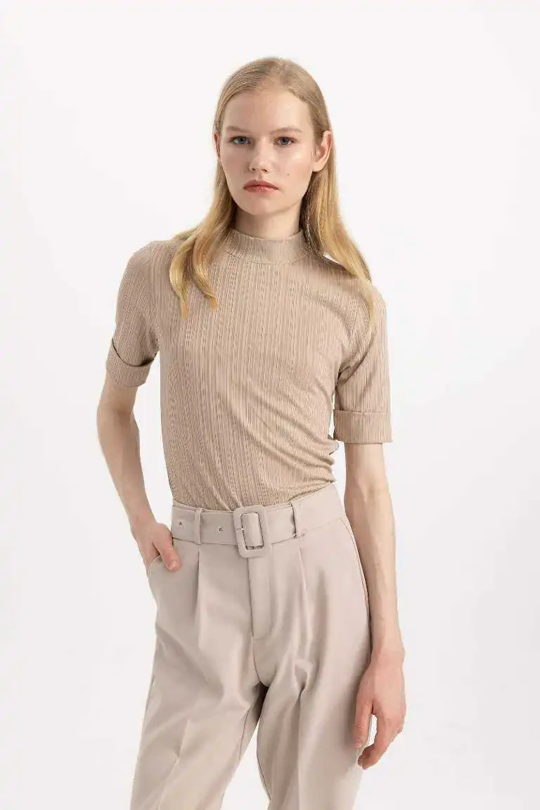 Regular Fit, Yarım Balıkçı Yaka, Fitilli Kaşkorse, Kısa Kollu, Taş Renkli Tişört