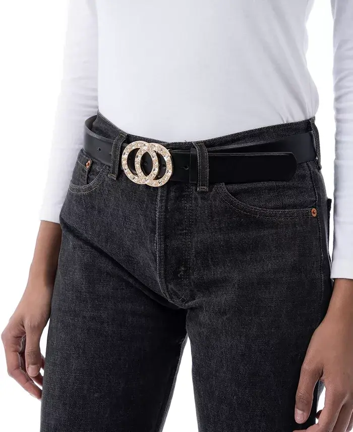 Double-Circle Rhinestone Belt, Created for Modazone-Black/Silver, Rhinestone detailing, Double-circle buckle, Prong closure, S - 30", M - 34", L - 38", XL - 42", Created for Modazone.