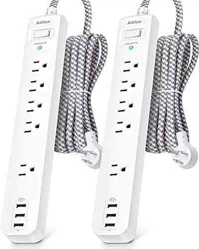 2-х Пакетный Сетевой Фильтр с Защитой от Перенапряжения - 5 Широко Размещенных Розетки 3 USB Порта Зарядки, 1875 Вт / 15 А с 5-футовым Плетеным Проводным Шнуром, Плоская Вилка, Защита от Перегрузки от Перенапряжения, Настенный Монтаж для Домашнего Офиса, Белый