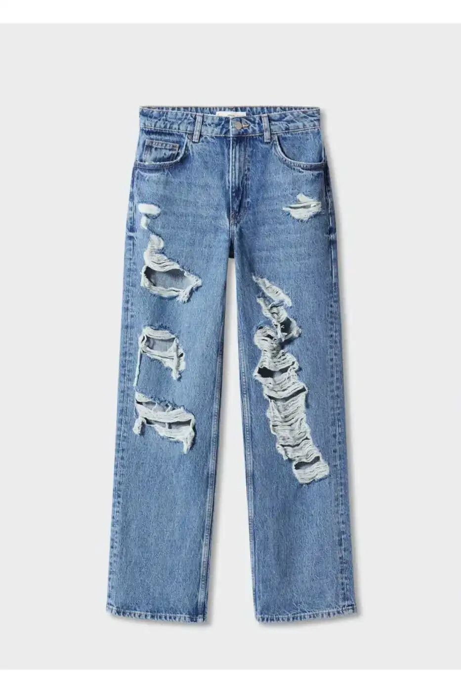 **Джинсы прямого кроя с высокой талией и потертостями****Описание продукта:**Эти стильные джинсы прямого кроя с высокой талией и потертостями станут отличным дополнением к любому гардеробу. Благодаря завышенной талии и потертостям они обеспечат как комфорт, так и привлекательный внешний вид.**Характеристики:*** **Материал:** 80% хлопок, 20% переработанный хлопок* **Покрой:** Прямой* **Длина:** Длинные* **Талия:** Высокая* **Детали:** Потертости, застежка-молния и пуговицы, пять карманов, шлевки для ремня* **Длина по внутреннему шву:** 83,4 см* **Длина по боковому шву:** 115,2 см* **Инструкции по уходу:** * МАШИННАЯ СТИРКА В ХОЛОДНОЙ ВОДЕ, ЩАДЯЩИЙ ЦИКЛ * НЕ ОТБЕЛИВАТЬ * ГЛАДИТЬ ПРИ НИЗКОЙ ТЕМПЕРАТУРЕ * ХИМЧИСТКА ЗАПРЕЩЕНА * СУШКА В СУШИЛЬНОЙ МАШИНЕ ЗАПРЕЩЕНА**Информация о распродаже:*** **Продавец:** Trendyol* **Количество в наличии:** Менее 5 единиц* **Цена по акции:** Да* **Ограничение по заказу:** 10 единиц* **Условия возврата:** Бесплатный возврат в течение 15 дней