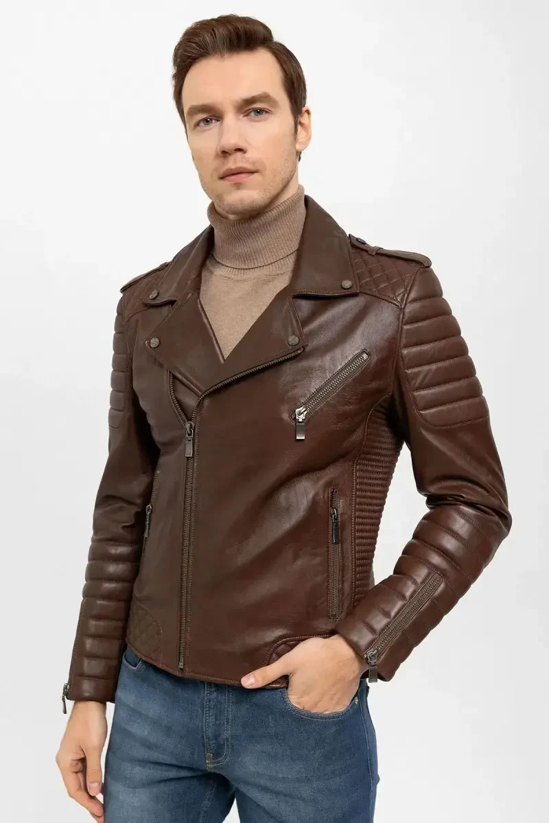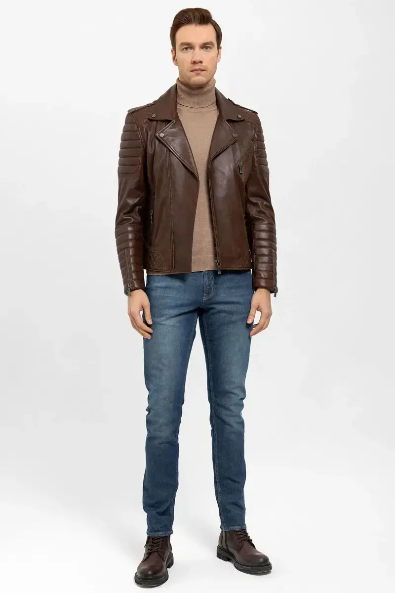 The E1001 Cognac Biker Men's Genuine Leather Jacket offers a stylish and comfortable look in all weather conditions. It is an ideal option for everyday use, motorcycle riding or special occasions.