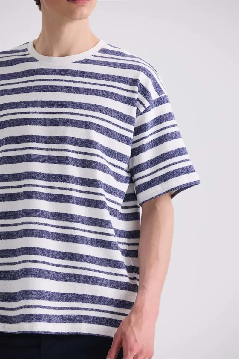 Oversize futbolka, chiziqli futbolka, bisiklet yaka futbolka, ekru futbolka, qulay futbolka, shik futbolka