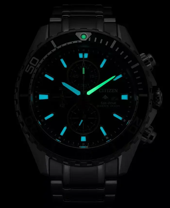 Ready to explore the mysterious depths of the seas? Meet Citizen's legendary Promaster Dive chronograph wristwatch! This watch not only tells time but also offers a lifestyle that reflects your adventurous spirit. With its stainless steel case and elegant design, it perfectly suits both daily use and underwater explorations. Thanks to Eco-Drive technology, say goodbye to the hassle of changing batteries! This watch, charged by natural or artificial light, offers you a seamless experience. With its water resistance up to 200 meters, it's an indispensable tool for diving enthusiasts. Measuring time is now more enjoyable with the chronograph feature. The date window allows you to easily access information no matter the time of day. The 45mm silver-colored stainless steel case combines elegance and durability on your wrist. With its green dial and rotating bezel, it offers both a visual feast and makes time tracking easier. You can benefit from free watch adjustment service when shopping at Modazone stores. By enrolling in the Modazone WorryNoMore® Jewelry and Watch Protection program, you can protect your watch within 30 days from the date of purchase. This program provides assurance against potential damages and allows you to enjoy your watch with peace of mind. The Citizen Promaster Dive chronograph wristwatch is an ideal choice for collecting unforgettable moments and complementing your style. Whether you're underwater or in the city, this watch is always with you.