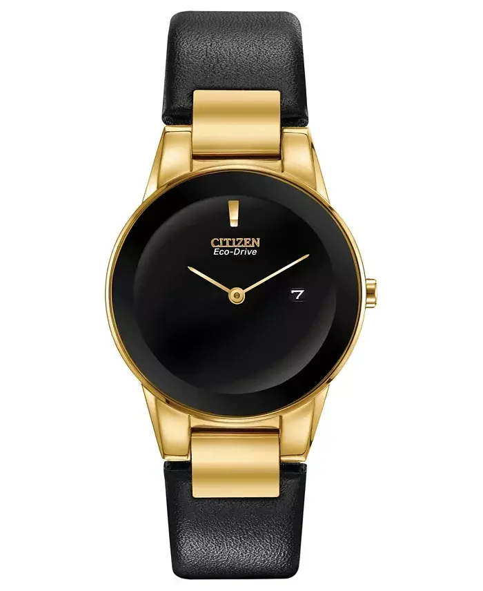 Eco-Drive Women's Axiom Black Leather Strap Watch combines elegance and technology in perfect harmony. This unique watch is designed for women who love elegance, offering an eye-catching accessory that will complement your style in both daily use and special occasions. One of the most remarkable features of the watch is that it runs on light energy. Thanks to Citizen's Eco-Drive technology, this watch can generate energy from any light source, eliminating the hassle of battery replacement and offering an environmentally friendly option. Its 30 mm gold-tone stainless steel case emphasizes the watch's luxurious and sophisticated appearance, while the black leather strap creates a classic and modern balance. The black dial enhances readability while highlighting the watch's elegance. The minimalist design on the dial supports the watch's elegant and simple aesthetic. This model of the Axiom series is not only a stylish accessory but also a practical aid in your daily life. Thanks to the date display, it ensures that you are always up-to-date. Additionally, its water resistance up to 100 meters allows you to use it safely in your daily activities and situations requiring water contact. Eco-Drive Women's Axiom Black Leather Strap Watch is offered with Citizen quality and assurance. The watch comes with a 5-year limited manufacturer's warranty, and you can get an extra year of warranty by registering your watch with Citizen. This shows that your watch is a long-lasting and reliable investment. Your product comes with its stylish box as seen in the picture and is also an ideal option for gifting. You can further secure your watch by joining the Modazone WorryNoMore® Jewelry & Watch Protection program. You can call Customer Service at 1-800-BUY-MACY (1-800-289-6229), use the Modazone Chat function, or visit any Modazone store to register for this program within 30 days from the date of purchase. This program ensures that your watch is protected against unexpected situations and offers you additional assurance. Complete your elegance with the Eco-Drive Women's Axiom Black Leather Strap Watch and enjoy Citizen's innovative technology.