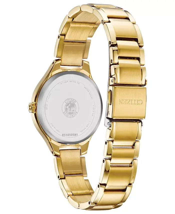 Experience elegance and technology with the Eco-Drive Women's Corso Diamond-Accent Gold-Tone Stainless Steel Bracelet Watch. This stunning watch from Citizen is designed to add sparkle to every moment. Its gold-tone stainless steel case and bracelet combine elegance and durability, while the curved lines add a graceful touch to the watch. Dazzling diamond accents are placed on the dial indices, adding a luxurious feel to the watch and captivating you with every glance.This watch is not just a time indicator; it's a style icon. Whether for daily use or special occasions, it will perfectly complement any outfit. The silver-tone dial harmonizes flawlessly with the gold-tone details, enhancing readability without compromising on style. The three-hand quartz movement ensures precise timekeeping, while Citizen's Eco-Drive technology eliminates the need for battery changes.Eco-Drive technology allows the watch to be charged by any light source, eliminating the need for battery replacements. This makes it an environmentally friendly choice and ensures that your watch is always ready to use. The 29 mm case diameter offers an ideal size for a woman's wrist, while the gold-tone stainless steel bracelet provides a comfortable wearing experience.The Citizen Eco-Drive Women's Corso Diamond-Accent Gold-Tone Stainless Steel Bracelet Watch is not just a stylish accessory but also a long-lasting investment. The 5-year limited manufacturer's warranty demonstrates our confidence in the quality of your watch, and you can get an additional year of warranty by registering your watch with Citizen. Additionally, you can protect your watch against unexpected situations by enrolling in the Modazone WorryNoMore® Jewelry & Watch Protection program.This special watch comes with the box shown in the picture and offers a perfect gift option for your loved ones. Please note that the photo may have been enlarged and/or enhanced, so it is important to pay attention to the specified dimensions for the actual size of the product. Complete your style with the Citizen Eco-Drive Women's Corso Diamond-Accent Gold-Tone Stainless Steel Bracelet Watch and let your elegance speak in every moment.
