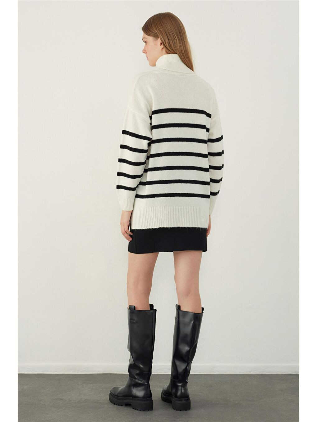 Create a stylish and comfortable option in your wardrobe with the Ecru Turtleneck Striped Basic Knitted Sweater. This sweater allows you to reflect your style in any environment with its modern lines and soft texture. Thanks to its 81% Acrylic and 19% Polyester blend yarn content, it keeps you warm and offers long-lasting use. Its wide fit allows you to have a comfortable wearing experience without restricting your freedom of movement, while its long-sleeved design keeps you warm in cold weather. The turtleneck detail protects your neck from the wind while giving you a stylish look. The striped pattern adds a modern touch to the sweater and allows you to create different combinations. You can reveal your style by combining it with your jeans for daily use or with a stylish skirt for a special day. This sweater, produced with Sherin quality, is not just a garment, but also a style statement. The S size on the mannequin is important to show how the product looks. Considering that the model has a height of 1.75, chest of 87, waist of 63 and hip of 90, you can determine your own size more accurately. The sweater measures 56 cm in chest width, 47 cm in sleeve length and 66 cm in body length in size S. In size M, the chest width is 58 cm, the sleeve length is 47 cm and the body length is 68 cm. In size L, the chest width is 60 cm, the sleeve length is 47 cm and the body length is designed as 70 cm. These measurements will help you choose the most suitable size. By following the washing instructions, you can extend the life of your product and preserve its original appearance. It is recommended to wash it inside out on a delicate cycle at a maximum temperature of 30°C. In this way, the structure of the fabric will not be damaged and the colors will not fade. The ecru color is compatible with all kinds of combinations and will be an indispensable part of your wardrobe. This sweater not only keeps you warm, but also completes your style. It is an ideal choice for women who want to be both comfortable and stylish.