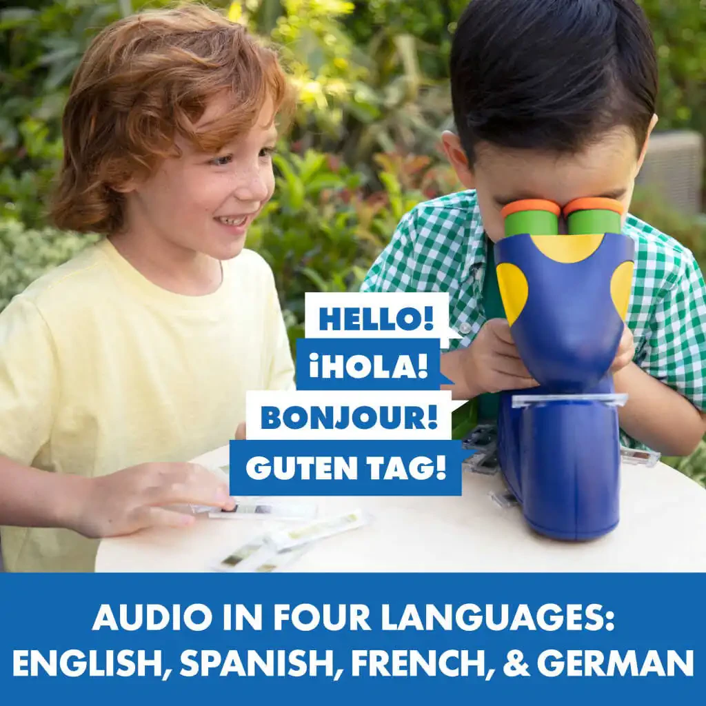 Kichik olimlar dunyosiga xush kelibsiz! Educational Insights's GeoSafari Jr. Talking Microscope, 3 yoshdan oshgan bolalar uchun maxsus ishlab chiqilgan, gapiradigan yagona mikroskopdir! Ushbu mukofotga sazovor bo'lgan va sotuvi ko'p bo'lgan o'yinchoq, bolalarning merak hissini uyg'otadi, ularni qiziqarli kashfiyotlarga olib boradi. Mikroskop, kichik oyoqlarga mos keladigan ergonomik dizayni va foydalanish oson interfeysi bilan, bolalarning mikroskopik dunyoga dastlabki qadamlarini tashlash uchun ideal vositadir. GeoSafari Jr. Talking Microscope nafaqat o'yinchoq, balki o'rganish vositasi hamdir. Bolalar mikroskop yordamida hayvonlar, o'simliklar va uy buyumlari kabi turli mavzular haqida ma'lumot olib, STEM (Fan, Texnologiya, Injeneriya va Matematika) sohasiga bo'lgan qiziqishlarini ham rivojlantirishi mumkin. Ushbu interaktiv o'yinchoq bolalarning erta yoshda ilm-fan bilan tanishishiga imkon berib, kelajakdagi ta'lim uchun mustahkam asos yaratadi. GeoSafari Jr. Talking Microscope bolalarning qiziqishini rag'batlantiradigan va o'rganishni qiziqarli qiladigan noyob tajriba taklif etadi. Bolalar 20 ta oldindan tayyorlangan slaydlar ustida (jami 60 ta rasm!) tekshirish ishlari olib borishlari va ushbu slaydlar tufayli turli mavzular haqida ma'lumot olishlari mumkin. Mikroskop ikki xil rejimni taklif etadi: Ma'lumot rejimi va imtihon rejimi. Ma'lumot rejimida bolalar har bir slayd ustidagi narsalar haqida qiziqarli ma'lumotlarni eshitadilar. Imtihon rejimida esa, Wildlife Warrior Bindi Irwin tomonidan ovoz berilgan 100 dan ortiq qiziqarli fakt va imtihon savollari bilan ma'lumotlarni mustahkamlaydilar. Ushbu interaktiv xususiyatlar bolalarning o'rganish tajribasini yanada qiziqarli va esda qolarli qiladi. GeoSafari Jr. Talking Microscope'dan foydalanish juda oson. Ikki dona qulay ko'z linzalari tufayli bolalarning bir ko'zlarini yopishlariga hojat qolmaydi, tasvirlarni bemalol tekshirishi mumkin. Mikroskop ichidagi slayd uyasi tozalashni va tartibni osonlashtiradi. Barcha slaydlar foydalanishdan so'ng mikroskop ichida xavfsiz saqlanishi mumkin. Educational Insights sifatida, 60 yildan beri bolalarning o'yin orqali o'rganishiga yordam beramiz. Mahsulotlarimiz har doim eng yaxshi sifatga ega bo'lishini ta'minlash uchun olimlardan o'qituvchilarga, rassomlardan boshqa mutaxassislarga qadar ko'p turli sohadagi mutaxassislar bilan ishlashdan faxrlanamiz. Mukofotga sazovor bo'lgan va ko'p sotilgan o'yinchoqlarimiz va o'yinlarimiz, Coding Critters, Hot Dots, Design & Drill, Playfoam, GeoSafari, Kanoodle va BrainBolt kabi, bolalarga yangi qiziqishlarni olib keladi va cheksiz imkoniyatlar va ehtiroslar eshiklarini ochadi. GeoSafari Jr. Talking Microscope bolalarning dunyoni boshqacha ko'z bilan ko'rishini ta'minlaydigan, ularni tadqiqotlar qilishga va kashfiyotlar qilishga rag'batlantiradigan ajoyib o'yinchoqdir. Bolalarning qiziqish hissini oshirish, ularning o'rganish yo'lida ularga yo'l-yo'riq ko'rsatish va kelajakdagi olimlarning yetishishiga hissa qo'shish uchun mo'ljallangan.