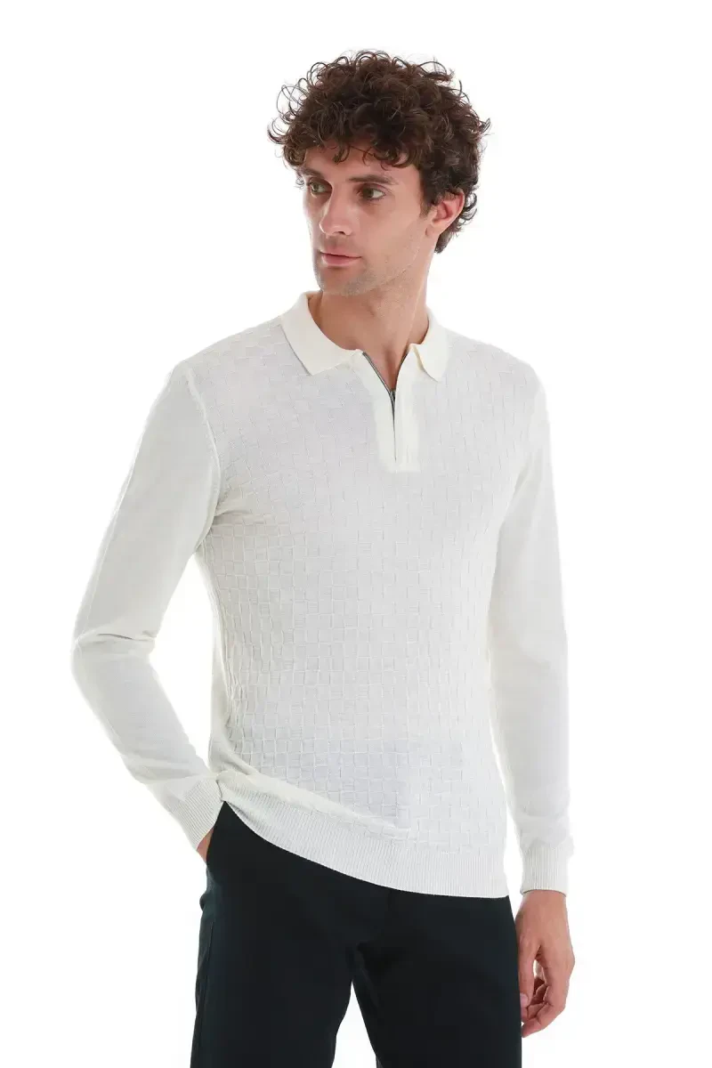 Ekru Yünlü Jakarlı Polo Yaka Triko Kazak