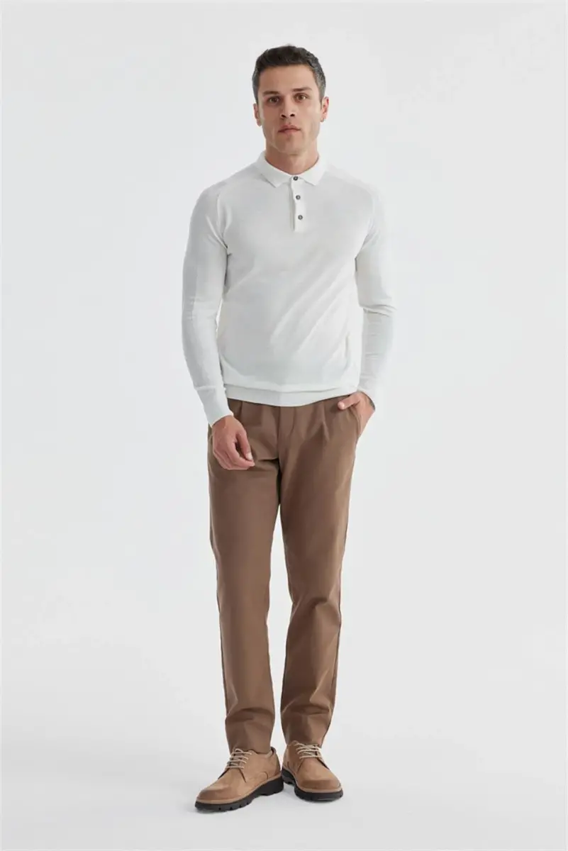 Ekru Slim Fit Yünlü Desenli Polo Yaka Triko