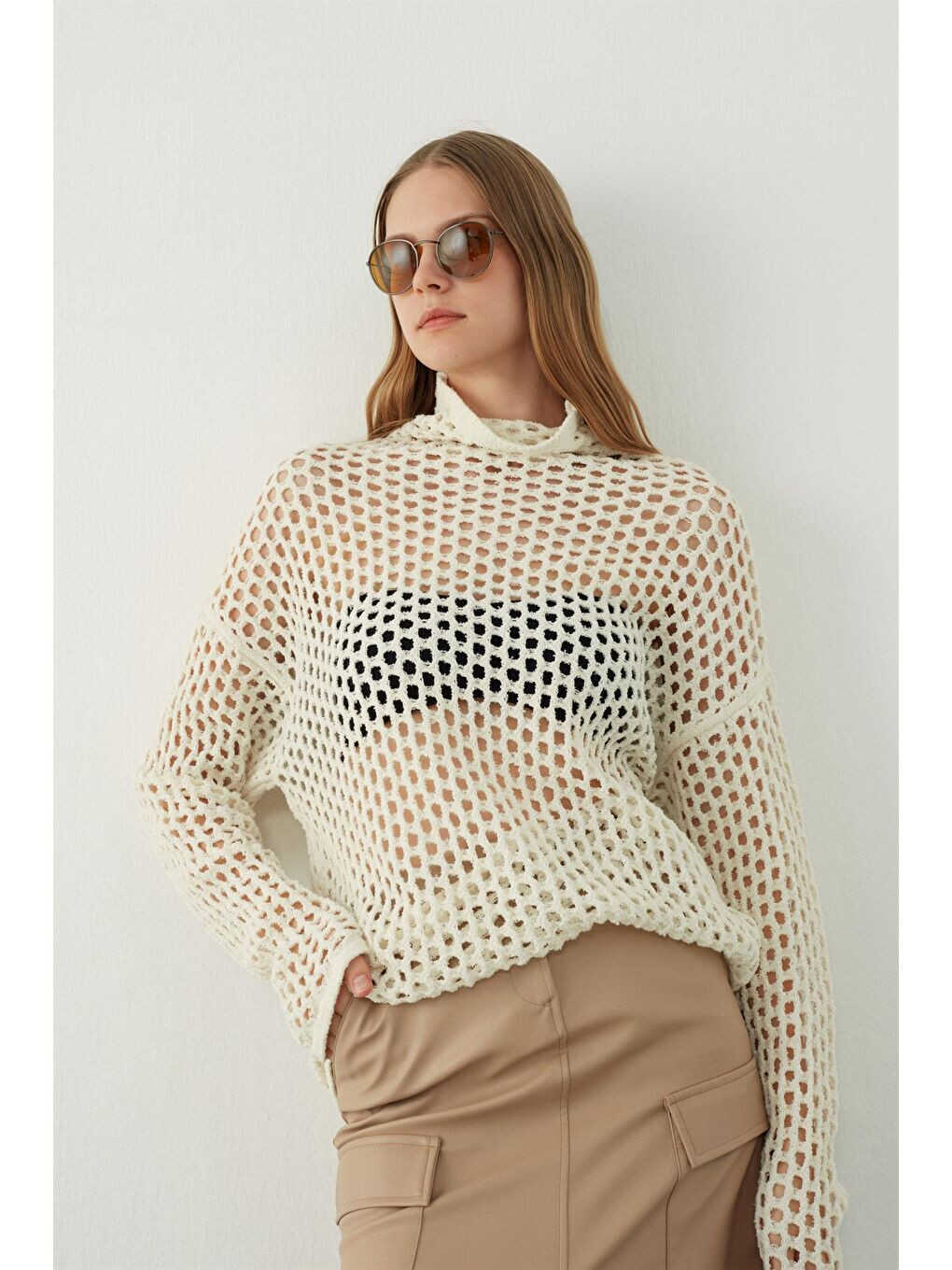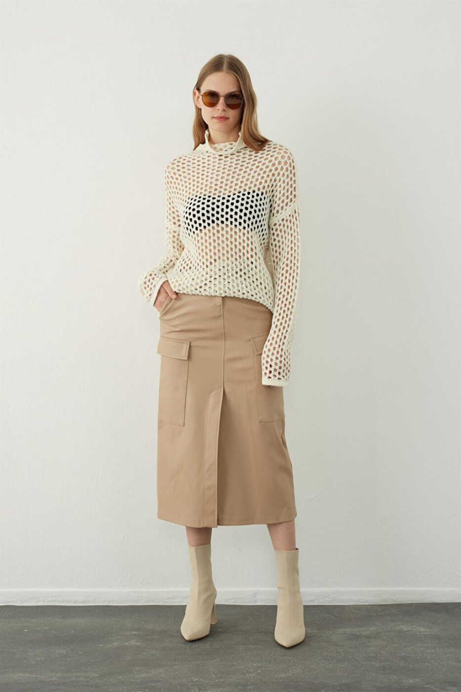 Ekru Rangli Teshik Triko Ko'ylagi bilan;