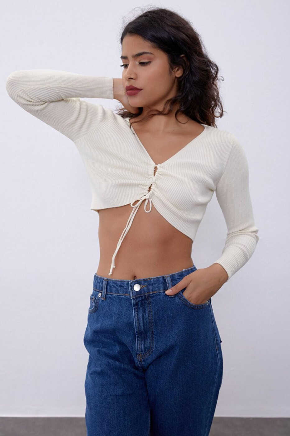 Ekru V Yaka Göğüs Dekolteli Triko Kazak ile şıklığı ve rahatlığı bir arada yaşayın!