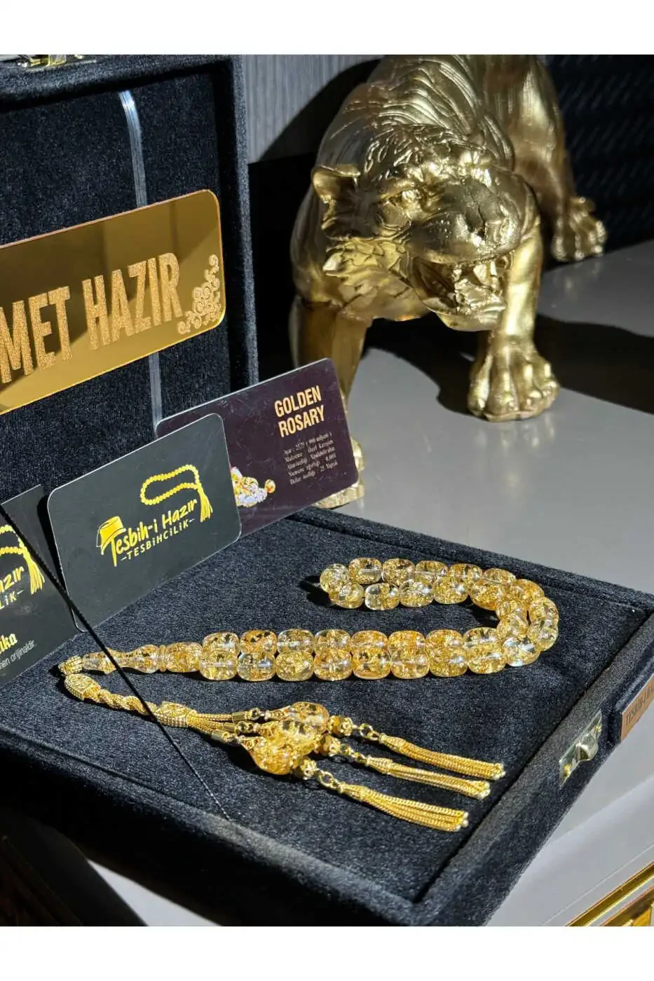 Эти бусины, выделяющиеся своим особым дизайном, привлекают внимание как своей элегантностью, так и духовной ценностью. Хлопья из 24-каратного золота в каждой бусине придают им классический и элегантный вид.