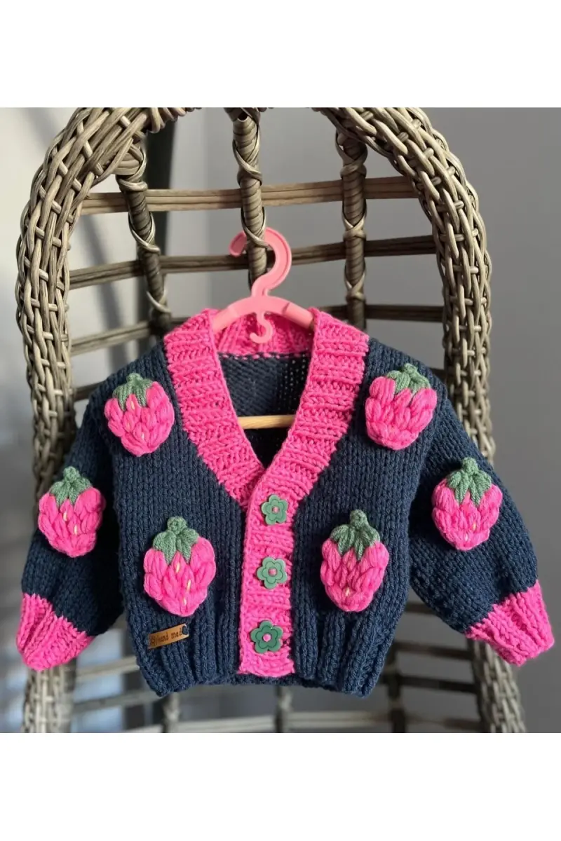 El Örgüsü Çilek Detaylı Kız Bebek ,Çocuk Hırkası-LACİVERT