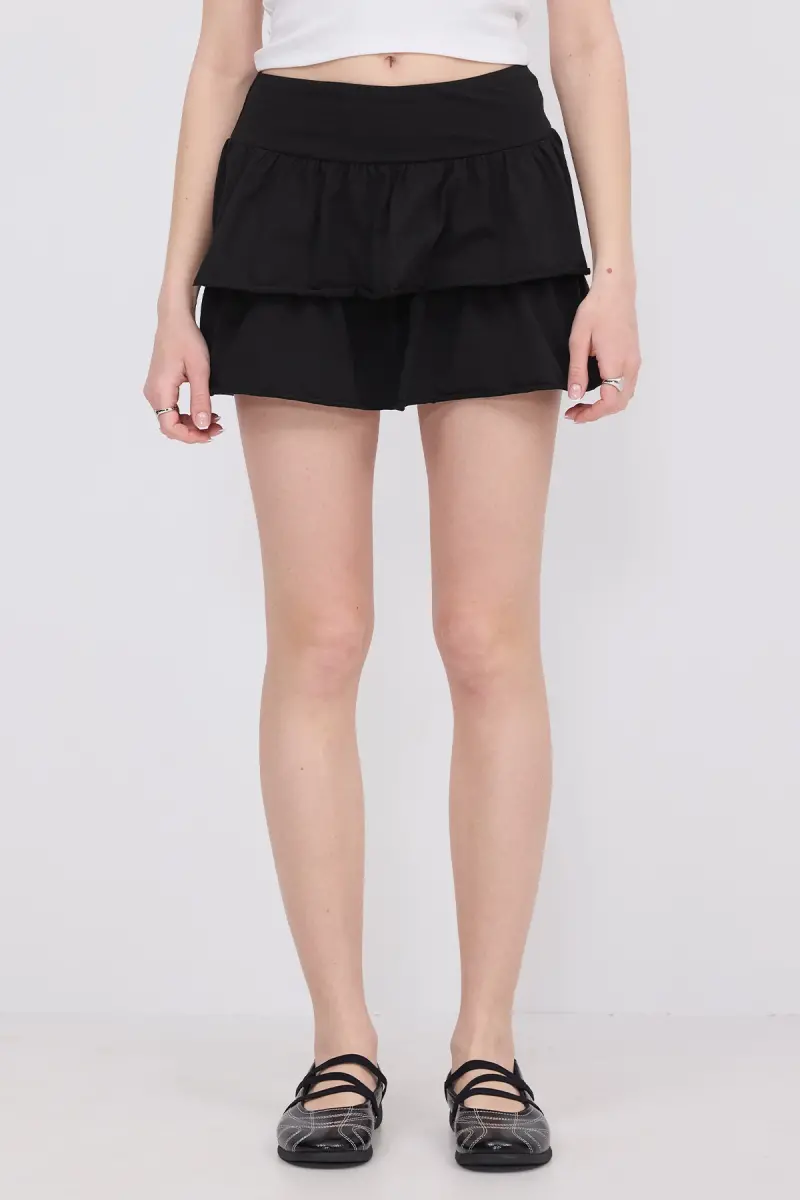 Elastic Waist Ruffled Mini Skirt is a design that combines elegance and comfort, and is a candidate to be an indispensable part of every wardrobe. This skirt stands out with its modern and feminine look, while its comfortable use allows you to be comfortable all day long. Ideal for mini skirt lovers, this model is enlivened with ruffle details and offers ease of use with its elasticated waist. Thanks to its black color, it adapts to all kinds of combinations and allows you to create different styles. You can choose this skirt for daily use or for a special event, it will highlight your elegance.**Product Description**Elastic Waist Ruffled Mini Skirt is a candidate to be one of the most loved pieces of your wardrobe! This skirt, which offers elegance and comfort together, attracts attention with its feminine details and modern design. The mini skirt cut reveals your legs in an elegant way, while the ruffle details add movement and vitality to the skirt. This skirt, which offers comfortable use all day long thanks to its elasticated waist, fits your body perfectly and does not restrict your freedom of movement. This mini skirt, which carries the nobility of black, adapts easily to all kinds of combinations and allows you to create different styles. Whether you attend a special occasion with a stylish blouse and heels, or achieve a casual elegance with a sporty t-shirt and sneakers. Elastic Waist Ruffled Mini Skirt allows you to reflect your style in any environment. This skirt, which offers long-lasting use thanks to its quality fabric, can be easily washed and ironed. The light structure of the fabric allows you to be comfortable even in hot weather, while the ruffle details add a different touch to the skirt. The elastic waistband fits your body perfectly and offers a comfortable wearing experience all day long. This skirt, which is an ideal choice for women who want to be both stylish and comfortable, will be an indispensable part of your wardrobe. Elastic Waist Ruffled Mini Skirt not only makes you look stylish, but also increases your self-confidence. You reflect your style with every step, without sacrificing your comfort. This skirt will be the savior of your wardrobe with its wearable structure in all seasons. You can create different styles by combining it with sandals in summer and boots in winter. The ruffle details on the skirt add a feminine and romantic touch, while the elastic waist makes it easy to put on and take off. This practical design saves you time on your busy days. If you want to prioritize your comfort without sacrificing your style, the Elastic Waist Ruffled Mini Skirt is for you. This skirt is a perfect choice not only for daily use but also for special events and invitations. You can achieve an eye-catching look by combining it with a stylish blouse and elegant jewelry. The classic and timeless elegance of black allows you to attract attention in any environment. You can always look stylish and well-groomed with the Elastic Waist Ruffled Mini Skirt. This skirt, which should definitely be in your wardrobe, is designed to suit the style of every woman. This skirt, which is ideal for both young girls and adult women, appeals to women of different age groups. Reflect your style with the Elastic Waist Ruffled Mini Skirt, let your elegance speak!**Product Features*** Mini skirt cut* Elastic waist design* Ruffled detail* Black color* Comfortable and stylish* Compatible with all kinds of combinations* Easy to put on and take off* Light and comfortable fabric**Additional Information**The model is wearing size S/36. Product content: 100% Polyester. It is recommended to wash according to the washing instructions. The colors of the product may vary in studio shots.