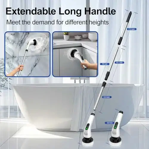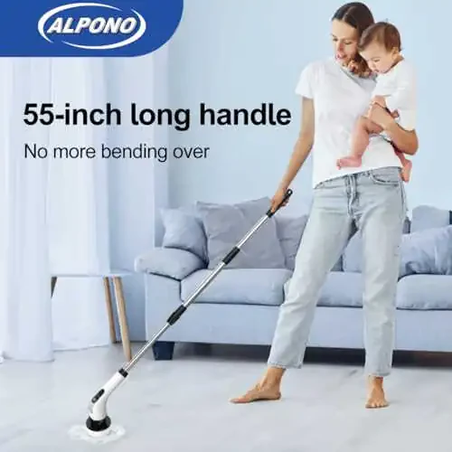 The ALPONO Cordless Powerful Shower Scrubbing Brush is a versatile cleaning solution designed to tackle stubborn limescale in your bathroom. With 7 interchangeable brush heads, it allows you to easily clean various surfaces, from bathtubs and tiles to floors and windows. It offers an ideal solution for cleaning needs in every corner of your home. Its long-handled design makes cleaning hard-to-reach areas easy. With a handle extending up to 54 inches, it provides thorough cleaning without bending or stretching, significantly reducing physical fatigue and making cleaning less tiring. Equipped with powerful rotating heads with two-speed adjustable settings, it saves you time and effort while cleaning stubborn stains and dirt buildup. Interchangeable heads for different cleaning tasks increase efficiency and ensure you always have the right cleaning tool. The cordless design eliminates cable clutter and allows you to clean freely without needing to be near an outlet. Its powerful motor allows you to effortlessly tackle all cleaning challenges, speeding up the process and making it more enjoyable. Thanks to its long battery life, you can enjoy uninterrupted cleaning sessions without frequent charging breaks. With the ALPONO Cordless Powerful Shower Scrubbing Brush, cleaning is now much easier and more efficient!