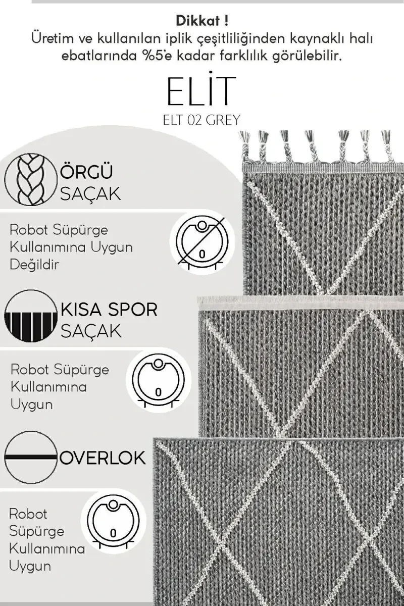 Elit 02 Grey Boucle Salon Carpet will add value to your home with its modern and stylish design. This carpet, which is compatible with all kinds of decorations with its geometric patterns and gray tones, not only offers a visual feast but also promises a comfortable usage experience. You can use this carpet in every corner of your home, from the kitchen to the corridor, from the living room to the bedroom, and it will add warmth and elegance to your living spaces. This product, offered with Cool Carpet assurance, offers a long-lasting use with its quality material and workmanship. The Elit 02 Grey Boucle Carpet, which is produced with modern machine weaving, is an ideal choice for those with allergies thanks to its non-shedding feature. You can choose this carpet to change the atmosphere of your home and increase your comfort. This carpet, which appeals to different tastes with its braided fringe, short sporty fringe and overlock edge types, adds a modern touch to your home and offers practical use thanks to its easy-to-clean feature. Elit 02 Grey Boucle Carpet, which offers a solution suitable for every area with its different size options (80x150, 80x300, 130x190, 160x230, 200x290), will be indispensable for your living spaces. This carpet, which can be adapted to any style, whether modern or classic, will complement your home's decoration and enchant your guests.