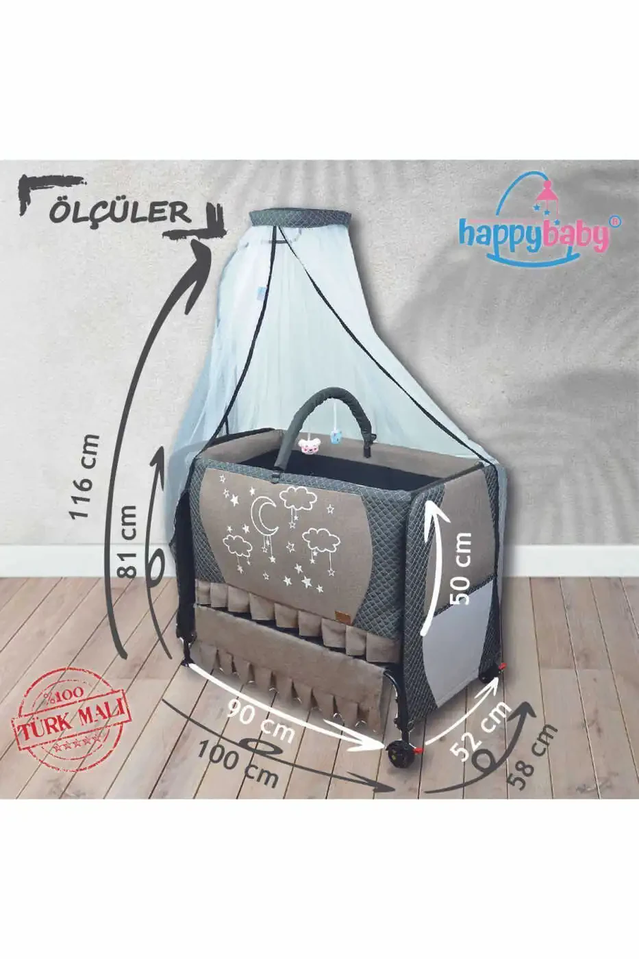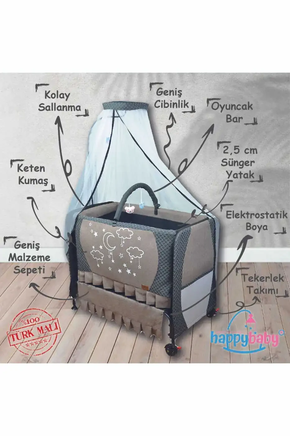 The Elite Luxury Comfort Cradle is made of high-quality materials and can be easily cleaned thanks to its wipeable feature. It does not contain any substances that could harm your baby's health. With HB Design lockable wheels, you can fix the cradle wherever you want or move it easily. Thanks to its 4 rocking bearing silent mechanism, your baby rocks without being disturbed. The 2.5 cm thick mattress sponge mattress supports your baby's spine and provides a comfortable sleep. The toy bar helps your baby have fun, while the material basket underneath allows you to store your baby's belongings in an orderly manner. The removable large mosquito net protects your baby from mosquitoes and other insects.