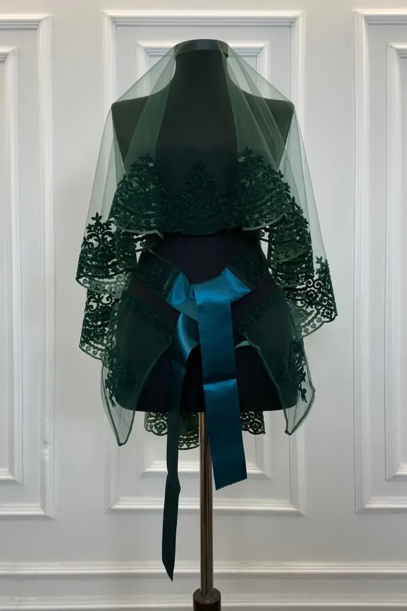 Emerald Green Bridal Veil Set, ready to add a unique elegance to your henna night or wedding with its classic pattern flock print and glittery details! This special design veil set combines traditional motifs with a modern touch, ensuring you experience unforgettable moments. The soft texture of the flock print and the sparkle of the glitters create a dazzling effect in every light, while the emerald green color symbolizes nobility.Product DescriptionEmerald Green Bridal Veil Set is designed for you to achieve a unique look on your special days such as henna night and wedding. The processing of classic patterns onto the veil with the flock printing technique offers a perfect harmony of traditional and modern design. Glittery details add movement and sparkle to the veil, while the emerald green color highlights your elegance. This set is not just a veil, but also a work of art and will remain as the most beautiful memory of your special days. The light and draped texture of the veil fabric provides comfortable use, while its length is adjusted to be compatible with different hairstyles. The softness of the flock print provides a pleasant touch to your skin, while the sparkle of the glitters will make you the star of the night. This special design veil set is at a level to meet the expectations of both traditional and modern brides, and will help you leave an unforgettable mark on your henna night or wedding. Considering the meaning of the emerald green color, this veil set is not just an accessory, but also symbolizes hope, renewal and abundance, accompanying you as you step into new beginnings. This veil set, which will perfectly match your henna night concept, will also create a magnificent backdrop for your photos that will immortalize these special moments you will spend with your loved ones.Product Features* Color: Emerald Green* Pattern: Classic Pattern Flock Print* Detail: Glittery* Usage Area: Henna Night, Wedding* Design: Traditional and Modern Harmony* Fabric: Light and Draped* Printing Technique: Flock Print* Sparkle: Dazzling Glitter Details* Comfort: Suitable for Long-Term Use* Compatibility: Compatible with Different HairstylesAdditional InformationDue to the delicate structure of the product, dry cleaning is recommended. When you are not using the product, you can preserve its original appearance by storing it in its original packaging or in an airtight box. To prevent the glitters from shedding, avoid rubbing the veil on hard surfaces. The product is a special design and is produced in limited quantities. Therefore, it is an unmissable opportunity for brides-to-be who want to have a unique veil set. You can easily combine it with your other accessories that you will use at your wedding or henna night and create a wholeness that reflects your own style. With the energy of the emerald green color, you will feel even more special on your special day. Other accessories (crown, jewelry, etc.) in the product image are not included in the price. Only the veil set will be sent.