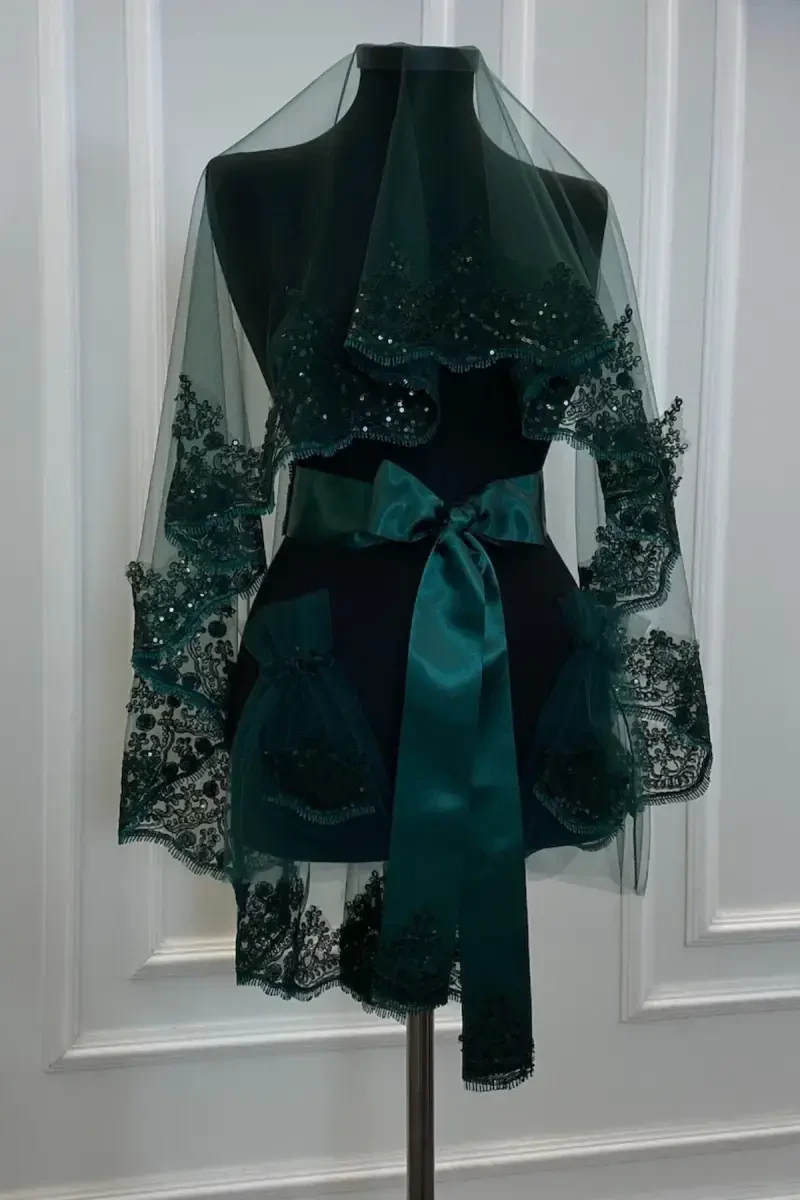 Emerald Green Sparkling Lace Henna Veil Set is designed to give you a dazzling look on your special days, especially your henna night. This unique bridal veil set combines elegance and style, helping you create unforgettable memories. The emerald green color represents nobility and vitality, while the sparkling lace details create a mesmerizing effect with every step you take. The set is not just a veil but also includes matching accessories, offering a perfect completeness from head to toe. It is an ideal choice for brides who want to experience traditional and modern elements together on their henna night. With this set, you will feel like a princess on your henna night and enchant everyone with your beauty. It is made of high-quality materials and will be a special keepsake that you can keep for many years. This veil set, which will be the most special part of your henna ceremony, will enchant not only you but also all your loved ones. With its sparkle and elegance, it will mark your henna night and crown your unforgettable moments. Every detail is carefully designed, combined with the magic of emerald green, offering you a unique experience. It will perfectly match your wedding dress and highlight your beauty. Don't miss this set to feel special and have an unforgettable henna night.Product DescriptionEmerald Green Sparkling Lace Henna Veil Set is designed to add unique elegance and splendor to your henna night. This special set combines the traditional henna concept with a modern touch, making you the most eye-catching star of the night. The enchanting tone of emerald green, combined with the sparkle of lace details, offers a stunning look that will inspire admiration with every step you take. The veil is made of high-quality materials and provides a light and comfortable use. Its long and flowing structure adds an elegant touch to your movements, while the sparkling embroideries on it shine under the light and dazzle. The matching accessories included in the set complement the elegance of the veil and help you achieve perfect harmony from head to toe. This set, which will add warmth and magic to the atmosphere of your henna night, also carries a souvenir quality that will immortalize your unforgettable memories. Every detail is meticulously crafted, and the Emerald Green Lace Henna Veil Set stands out with its quality workmanship and aesthetic design. It will perfectly match your wedding dress, highlighting your beauty and elegance in the best way. With this special set, you will feel like a fairy tale hero on your henna night, and you will create unforgettable memories with your loved ones. Combining the nobility of emerald green and the sparkle of lace, this set is a candidate to be the most special and unforgettable part of your henna night. Choose this unique veil set to feel special and valuable and to make your henna night unforgettable.Product Features* Color: Emerald Green* Lace Detailed* Sparkling Bright Embroideries* High Quality Material* Light and Comfortable Use* Matching Accessory Set* Long and Flowing Design* Compatible with Wedding Dress* Eye-Catching and Elegant AppearanceAdditional InformationThe product is sent in a specially designed box. Dry cleaning is recommended. Keep away from direct sunlight for long-lasting use. Accessory variety may vary depending on stock status. The color of the product may vary depending on your screen settings.