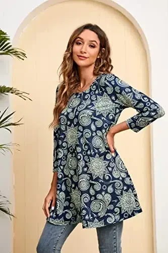 ENMAIN ayollarining toplari 3/4 yengli nafis kundalik katta o'lchamli tunika toplari legginglar bilan kiyish uchun keng etakli futbolka erkin bluzkalar